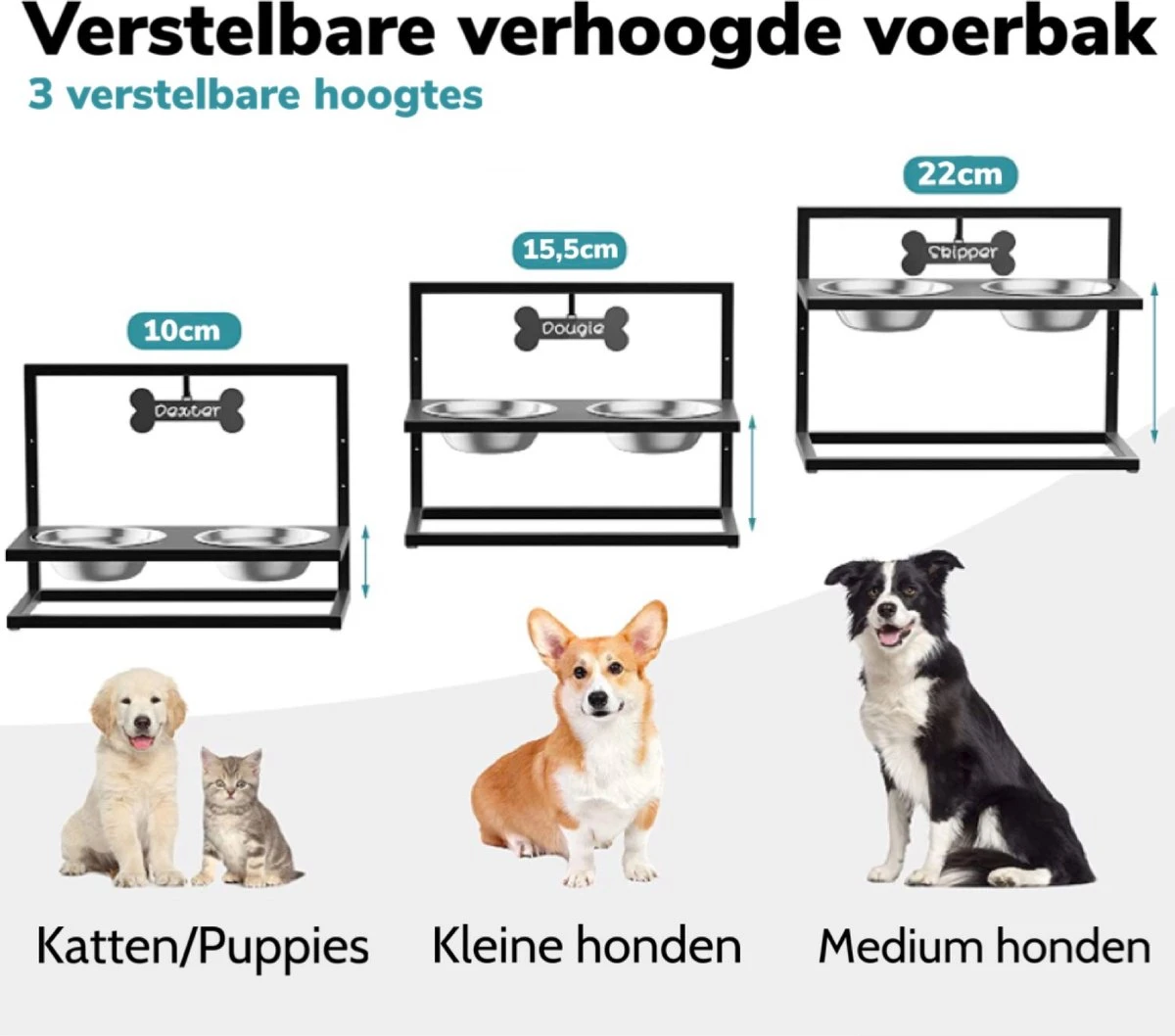- Dankzij de keuze uit drie verschillende hoogtes biedt de voederstandaard genoeg opties. Of je nu een kat, puppy, kleine hond of middel grote hond hebt: er is voor elke soort een geschikte hoogte. De maximale hoogte van de voerbakkenhouder is 22cm, het middelste niveau is 15,5cm en het laagste niveau 10 cm.