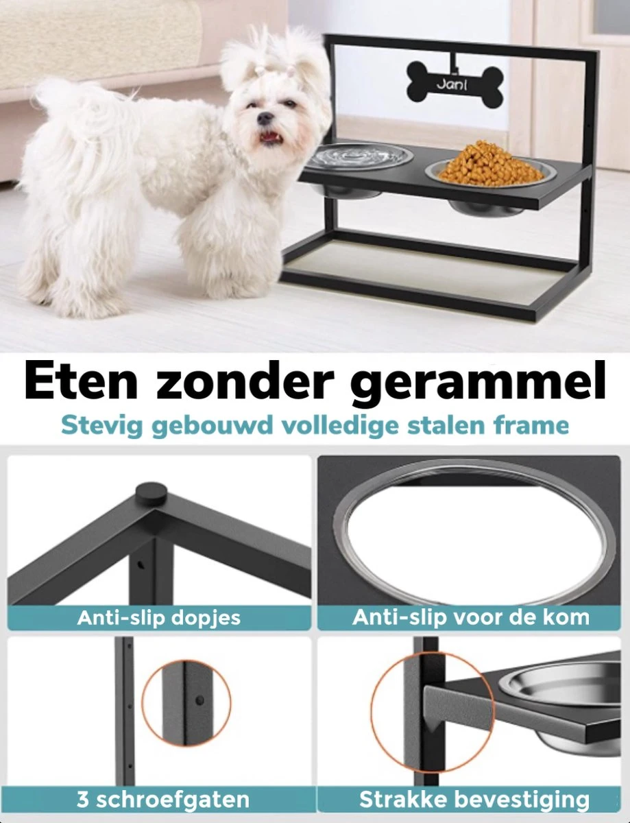 - Met de kommenset van BJ pets inclusief houder kan je uw hond een comfortabele lichaamshouding laten aannemen tijdens het eten. Bovendien blijven lange oren schoon. De set is 3 keer verstelbaar. Voor elke hond of kat de juiste hoogte