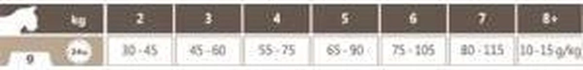 | Analytische bestandsdelen | Ruw eiwit 25%, Ruw vet 12%, Ruwe celstof 3,4%, Ruwe as 4,5%, Vocht 10%, Koolhydraten 45,1%, Calcium 0,70%, Fosfor 0,69%, Natrium 0,28%, Magnesium 0,09%, Kalium 0,55%, Taurine 1200 mg/kg, Lysine 1%, Methionine 0,55%, Cystine 0,38%, Treonine 0,87%, Tryptophaan 0,2%, Linolzuur 1,56%, Linoleenzuur 0,3%. |