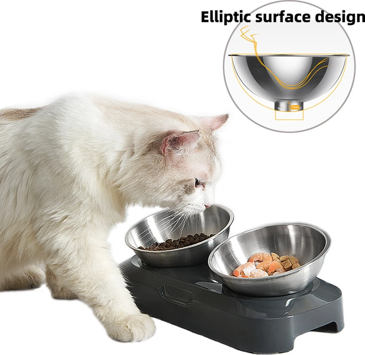 De voerbak is speciaal ontworpen om het eten voor katten comfortabeler en gezonder te maken. De voerbak staat in een verhoogde standaard en kan worden ingesteld op een hoek van 15 graden. Hierdoor hoeven de katten niet door de poten te zakken en zich niet te ver naar beneden buigen om te eten. Dit is zeer gunstig voor de spijsvertering van de kat, waardoor complicaties zoals braken minder zullen voorkomen.