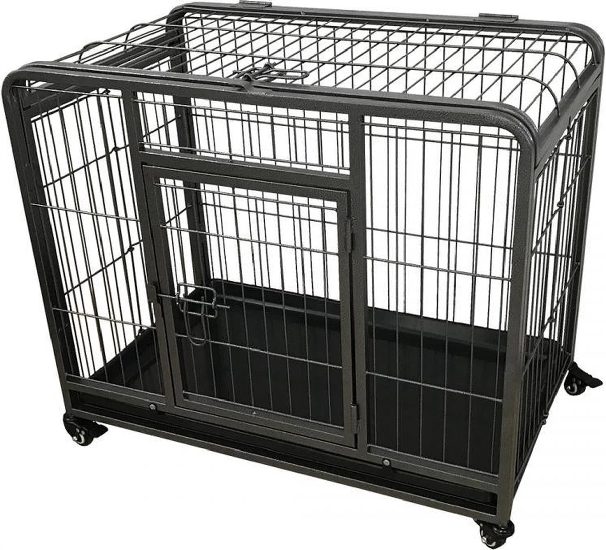 Deze hondenbench is gemaakt van metaal en heeft een kunststof opvangplaat.