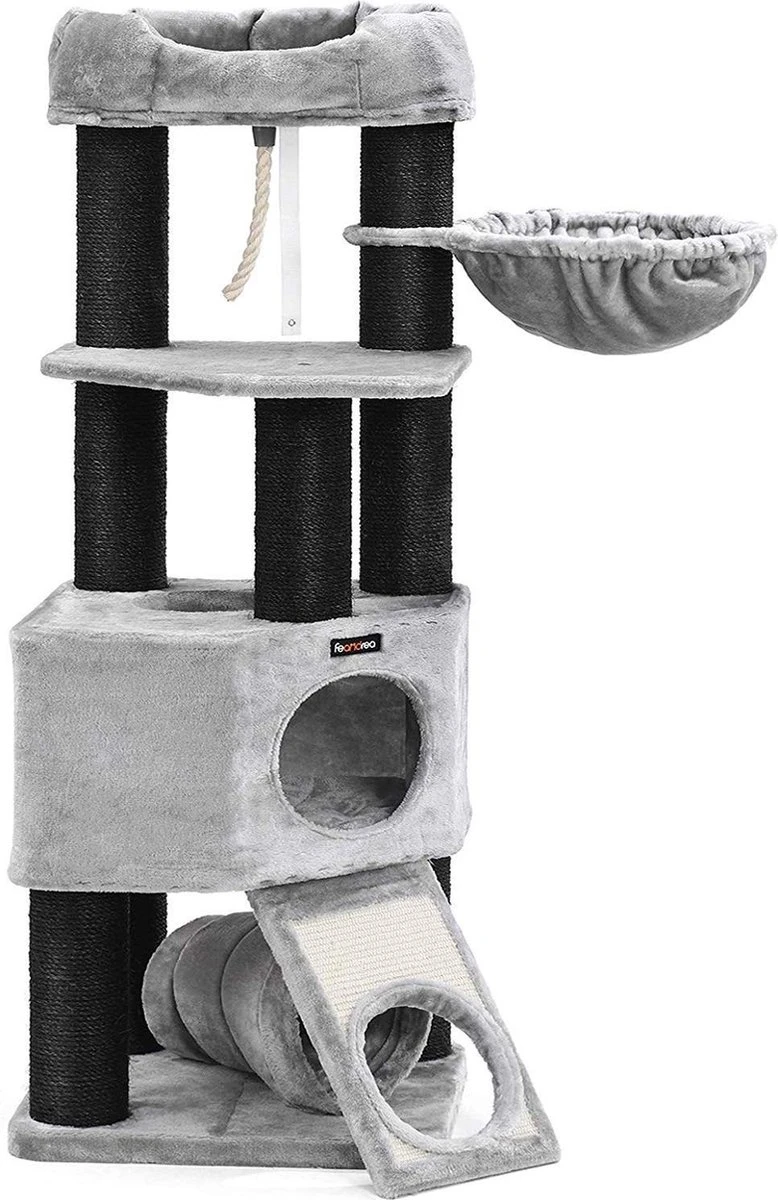 De hierboven getoonde klimtoren heeft de huurtest doorstaan. Vooral de grote knuffelholte en het pluizige uitzichtplat, die elk van een zachte mat zijn voorzien. Maar ook de tunnel en de krabplank in het onderste gedeelte van het kattenspeelgoed waren heet begeerd.