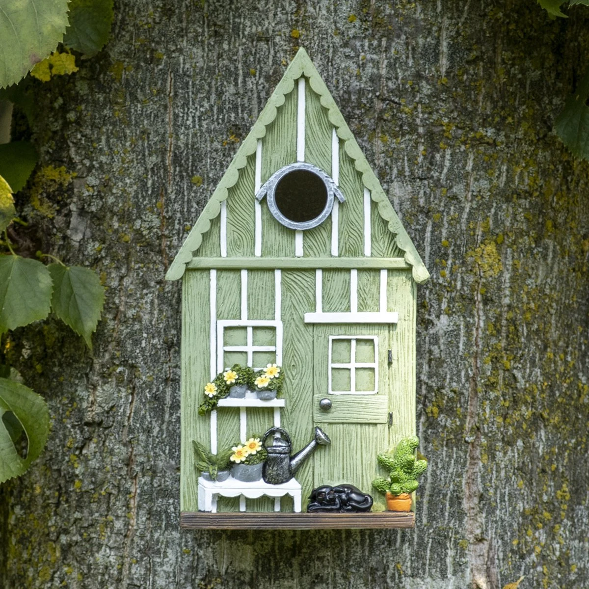 Aan de voorzijde zit een invliegopening van circa 27 mm. Dat maakt deze nestkast zeer geschikt voor de pimpelmees, kuifmees, zwarte mees glanskop en matkop. Het huisje is gemaakt van weersbestendig polyresin. Aan de achterzijde zit een sleutelgat, die dient als ophangoog. Aan de onderzijde zit een bodem die je kunt verwijderen door de bodem op te tillen. Hierdoor kant het huisje eenvoudig worden gereinigd. Het huisje heeft een afmeting van circa 13,9 x 13,4 x 25,1 centimeter (lxbxh).