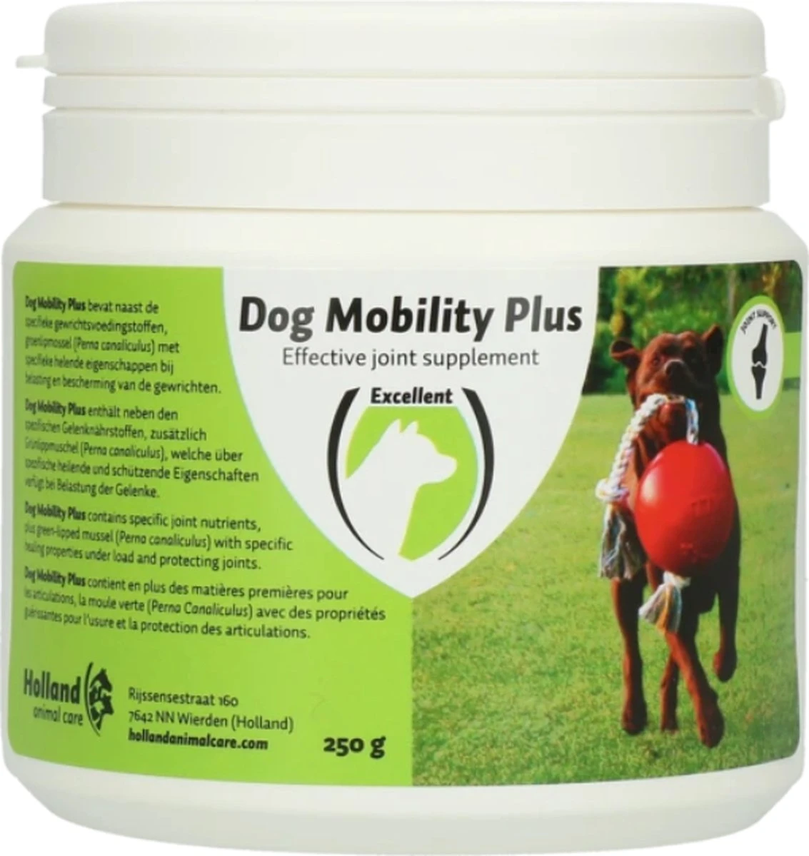 - Dog Mobility van het merk excellent bevat groenlipmossel met helende eigenschappen bij belasting en bescherming van de gewrichten.