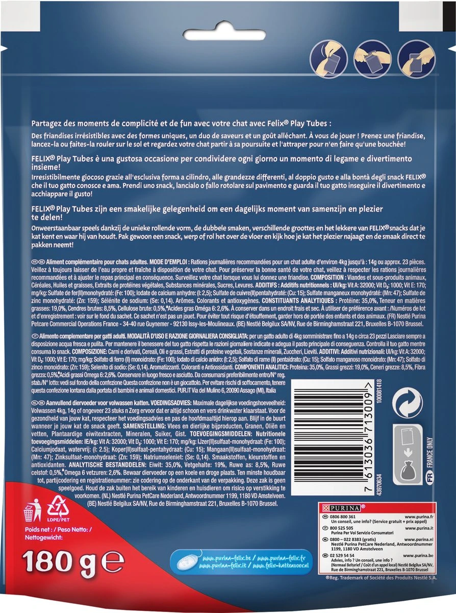 NIEUWE FELIX® Play Tubes zijn een smakelijke gelegenheid om een dagelijks moment van samenzijn en plezier te delen! Onweerstaanbaar speels dankzij de unieke rollende vorm, de dubbele smaken, verschillende groottes en het lekkere van FELIX® snacks dat je kent en waar hij van houdt. Pak gewoon een snack, werp of rol het over de vloer en kijk hoe je het plezier najaagt en de smaak direct te pakken heeft!