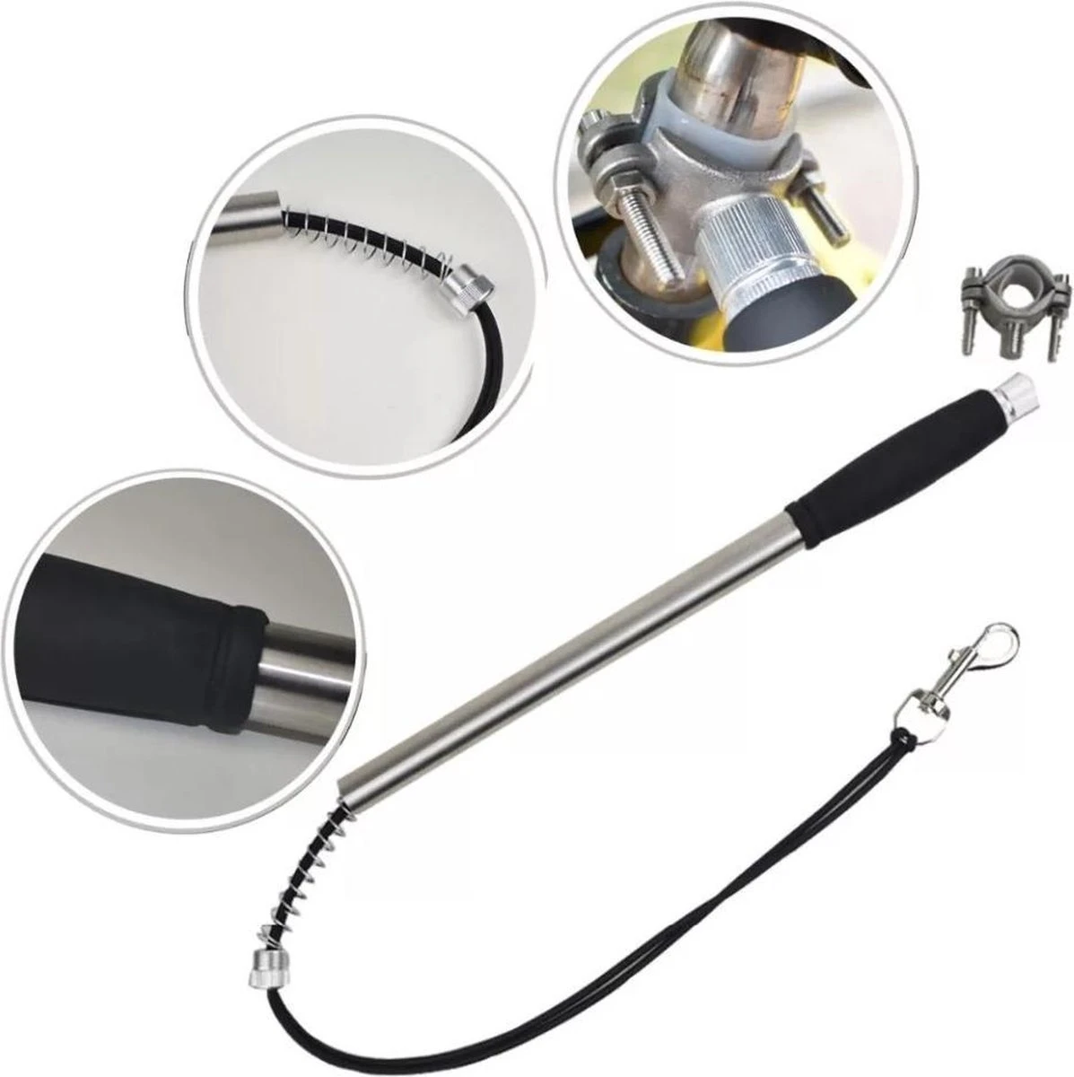 Je monteert de zet aan de zadelpen van je fiets en de stang steekt iets uit, zo blijft je hond altijd op gepaste afstand naast je lopen aan de juiste kant van de weg. Uiteraard zal de set de fiets zelf niet beschadigen. De fiets set zorgt er onder andere voor dat rukkend trekken door je hond wordt getemperd dankzij de stabiele vee