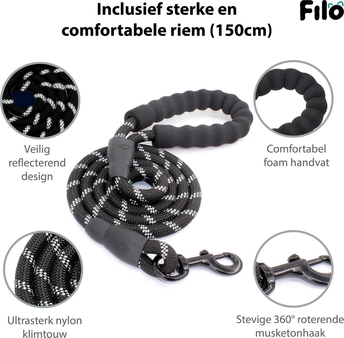 Dit Filo hondentuigje met hondenriem biedt de oplossing voor ieder die opzoek is naar een kwalitatief hondenharnas en hondenriem. Het Y-vormige design van het hondentuig zorgt voor een goede drukverdeling en bewegingsvrijheid, zodat wandelen voor je hond een feestje wordt. De sterke metalen ring aan de voorkant van het tuigje zorgt ervoor dat je hond gecorrigeerd kan worden bij het trekken zonder je lieve viervoeter te verstikken. Aan de bovenkant bevind zich een ring voor normale bevestiging tijdens het uitlaten.