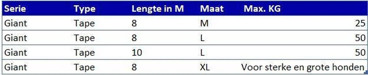Bij Flexi kan je kiezen tussen lijnen met een koord en lijnen met tape. Het is een persoonlijke voorkeur welke variant je het fijnst vindt. In principe zijn beide soorten even sterk en veilig om te gebruiken. De Giant XL bevat een tape.