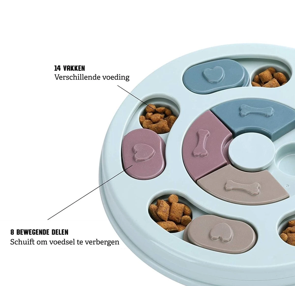 De hondenpuzzel bestaat uit een aantal snackvakken met bewegende delen. Deze houden uw hond bezig en kunnen de probleemoplossende vaardigheden van uw hond verbeteren. Dit interactieve speelgoed is een ideale dagelijkse bezigheid maar het voorkomt ook problemen als: zwaarlijvigheid, verstikking, winderigheid, overmatig eten en spijsverteringsproblemen.