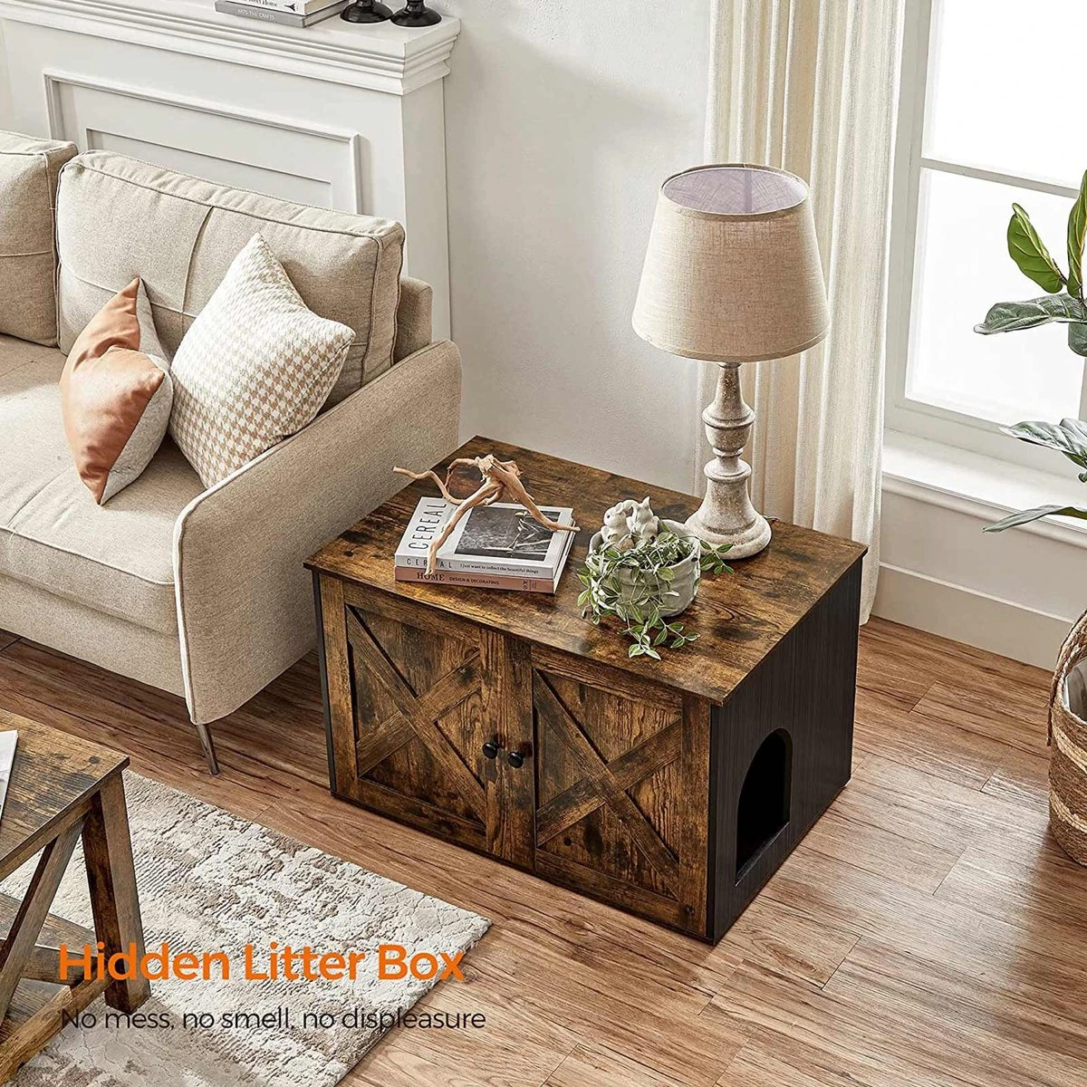 Achter de deuren… zit een vak van 50 x 50 x 46 cm waarin bijna alle gangbare kattenbakken passen. Een scheidingswand aan de rechterzijde zorgt voor meer privacy. Hoe zit het met het verwijderen van de partitie? Jij beslist!