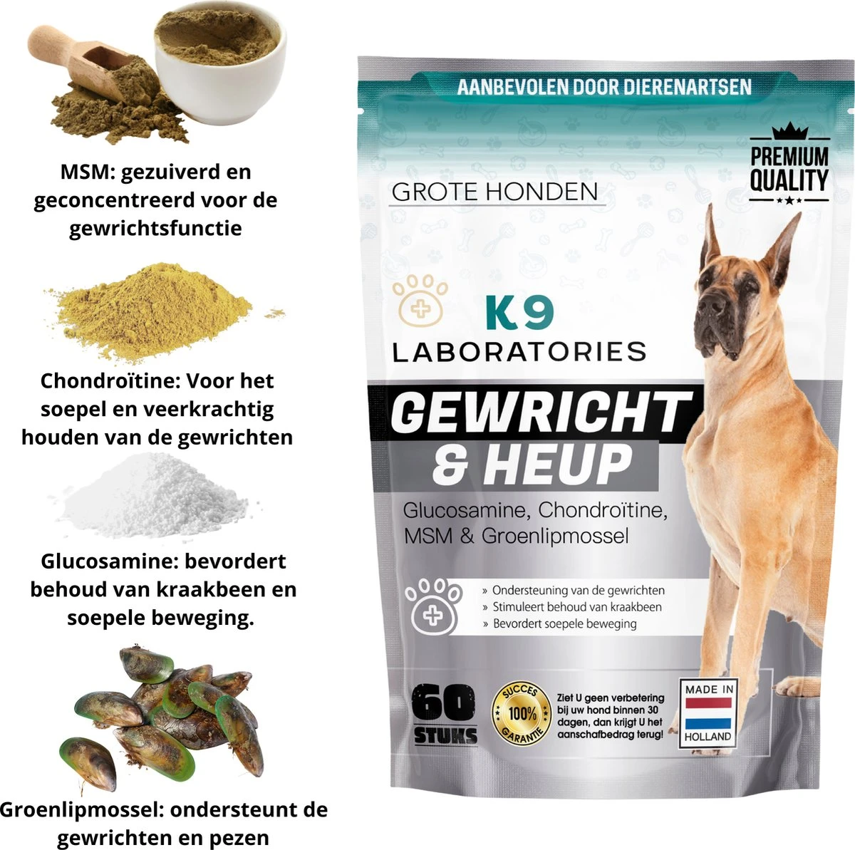 K9 Laboratories gewricht & heup supplement voor grote honden. Bij mank lopen, moeite met opstaan, (ouderdoms)artose, HD (heupdysplasie), ED (elleboogdysplasie).