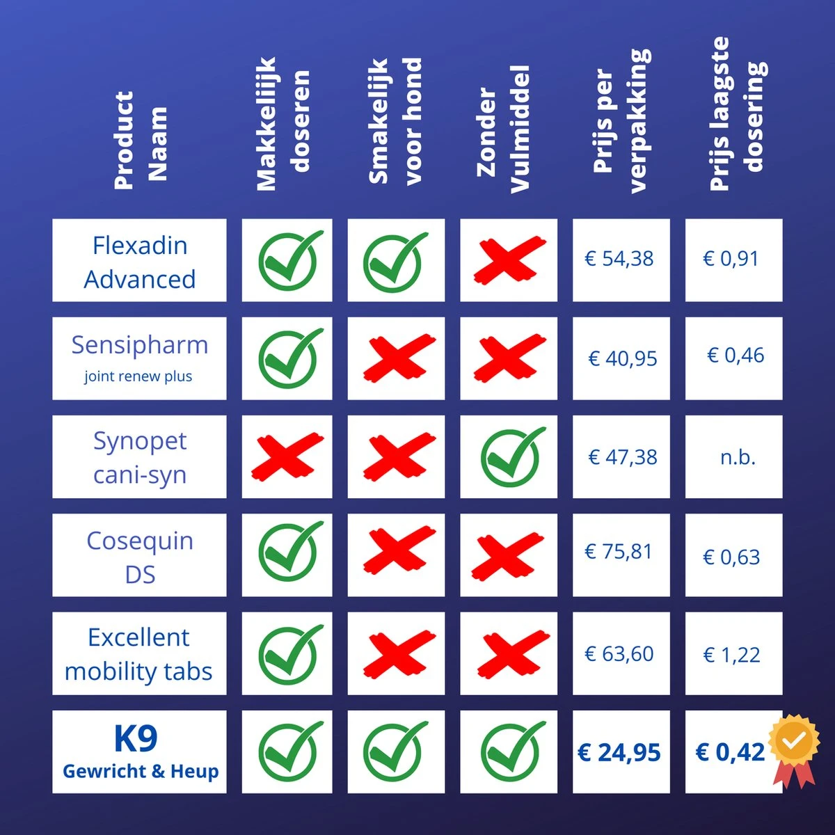 Wondermiddelen bestaan niet en het is niet toegetsaan om medische claims te maken voor (diervoeder)supplementen. Wat onze klanten betreft, voor baasjes met grote honden, komt dit supplement er wel heel dichtbij in de buurt als we afgaan op hun positieve reacties en reviews!