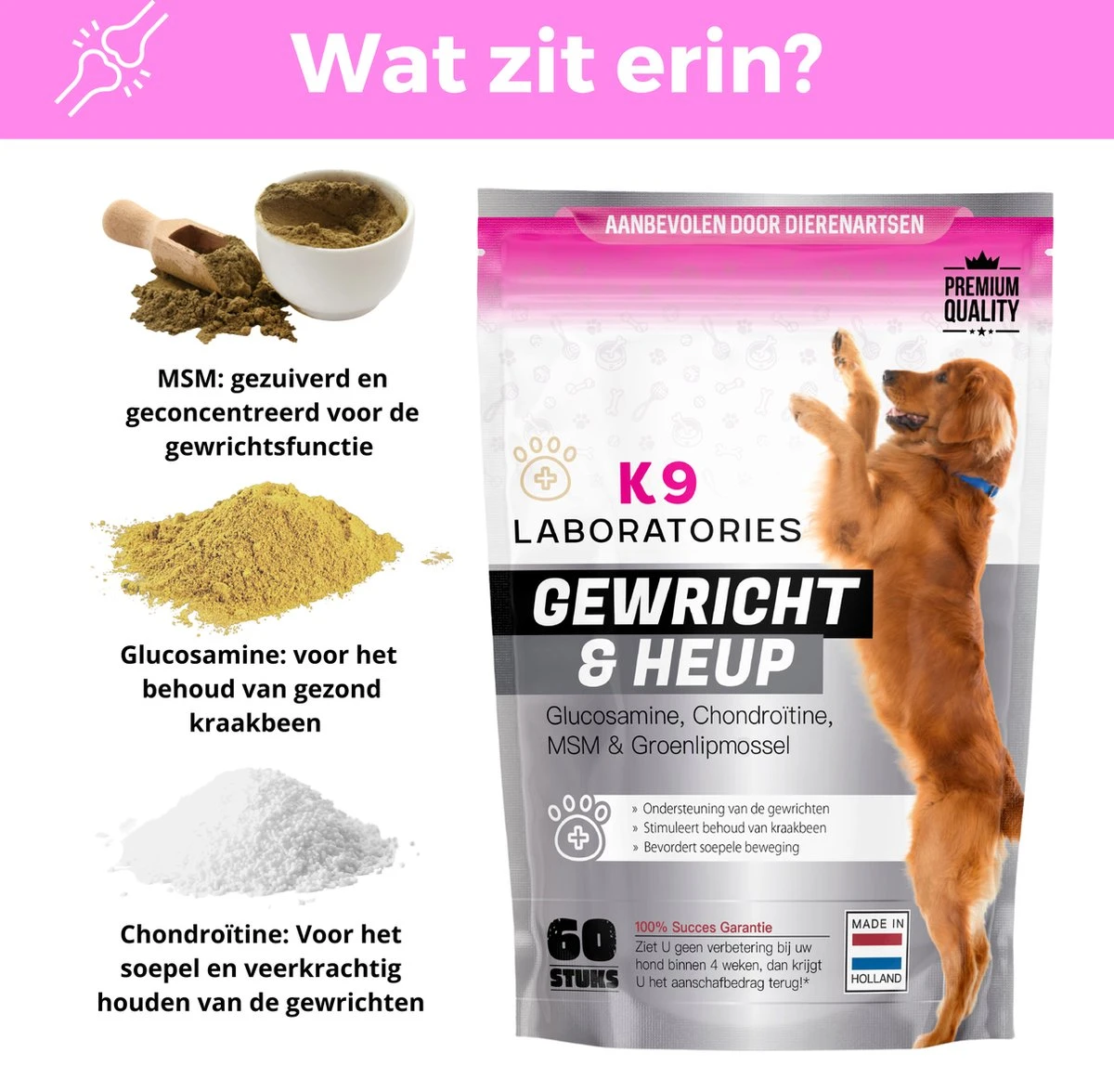 Let op: de hoofdbestanddelen glucosamine, chondroïtine, groenlipmossel en MSM zorgen ervoor dat het behoud van kraakbeen wordt gestimuleerd en dat de gewrichten van uw hond als het ware ‘gesmeerd’ worden. Dit ondersteunt de gewrichten en kan een bijdrage leveren aan het laten verdwijnen van de pijnlijke wrijving tussen de gewrichten als sneeuw voor de zon!