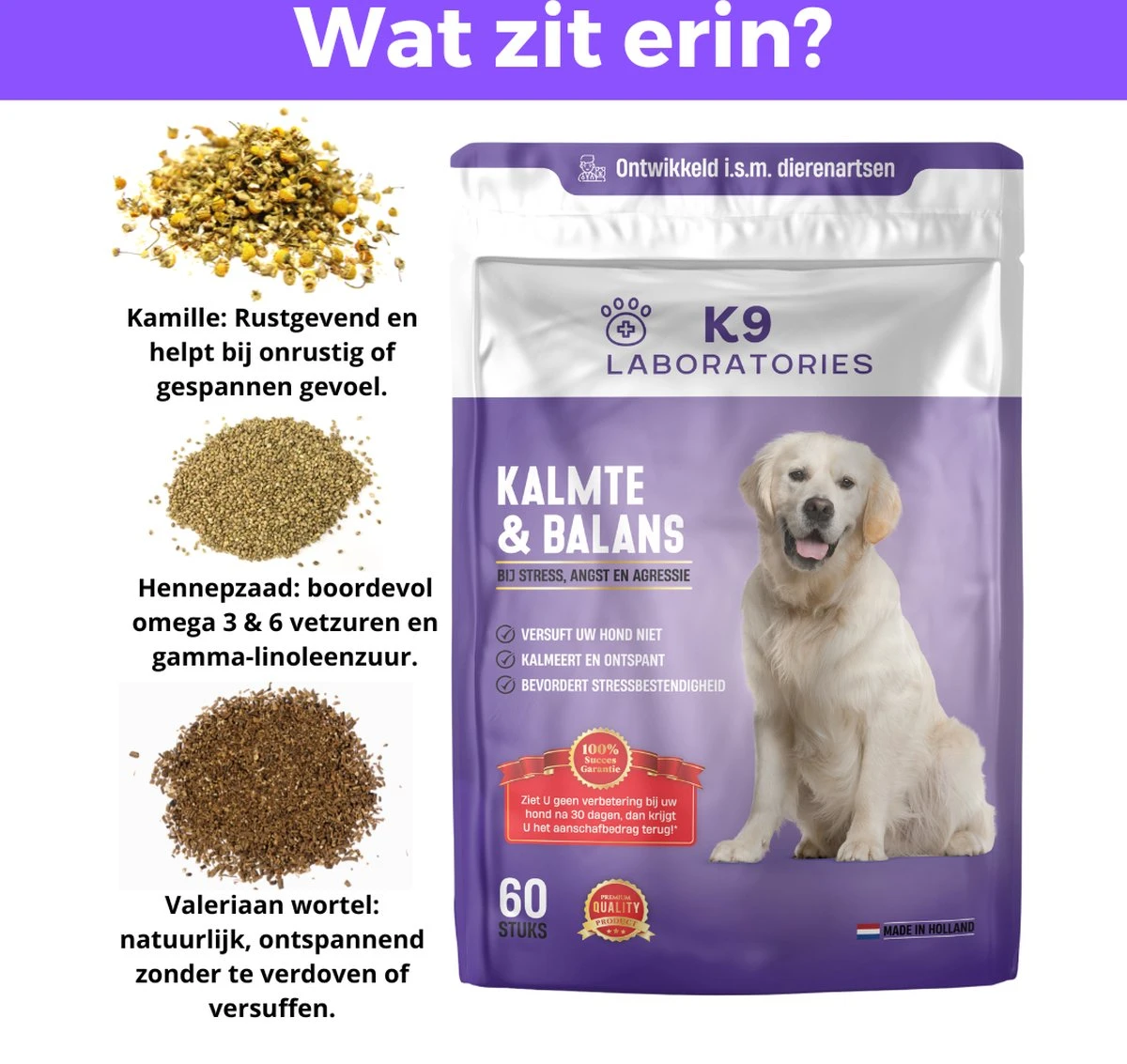 K9 Laboratories Kalmte & balans 60 stuks. Voedingssupplement als snackje voor honden bij angst, stress, nervositeit of agressie.