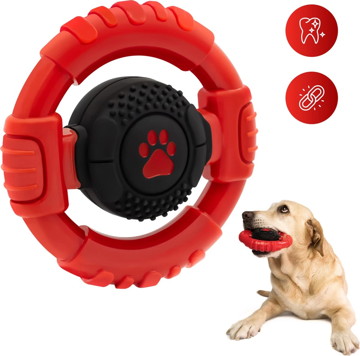 De structuur van het kauw stuurwiel zorgt ervoor dat de tanden en het tandvlees gemasseerd worden. Het speelgoed zorgt dus voor eindeloos kauwplezier en helpt bij het verzorgen van het gebit.