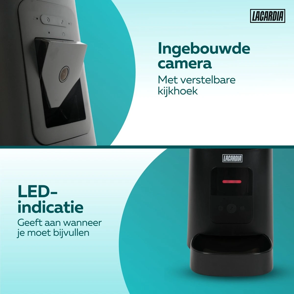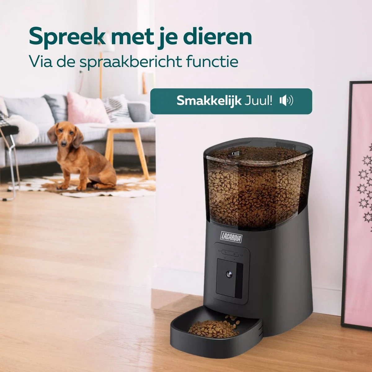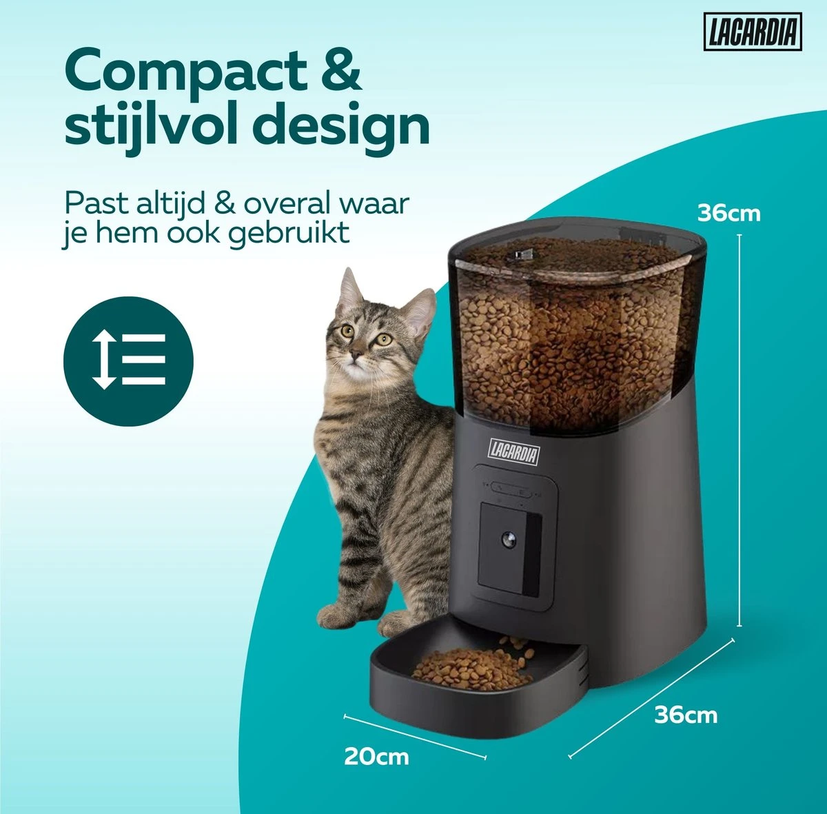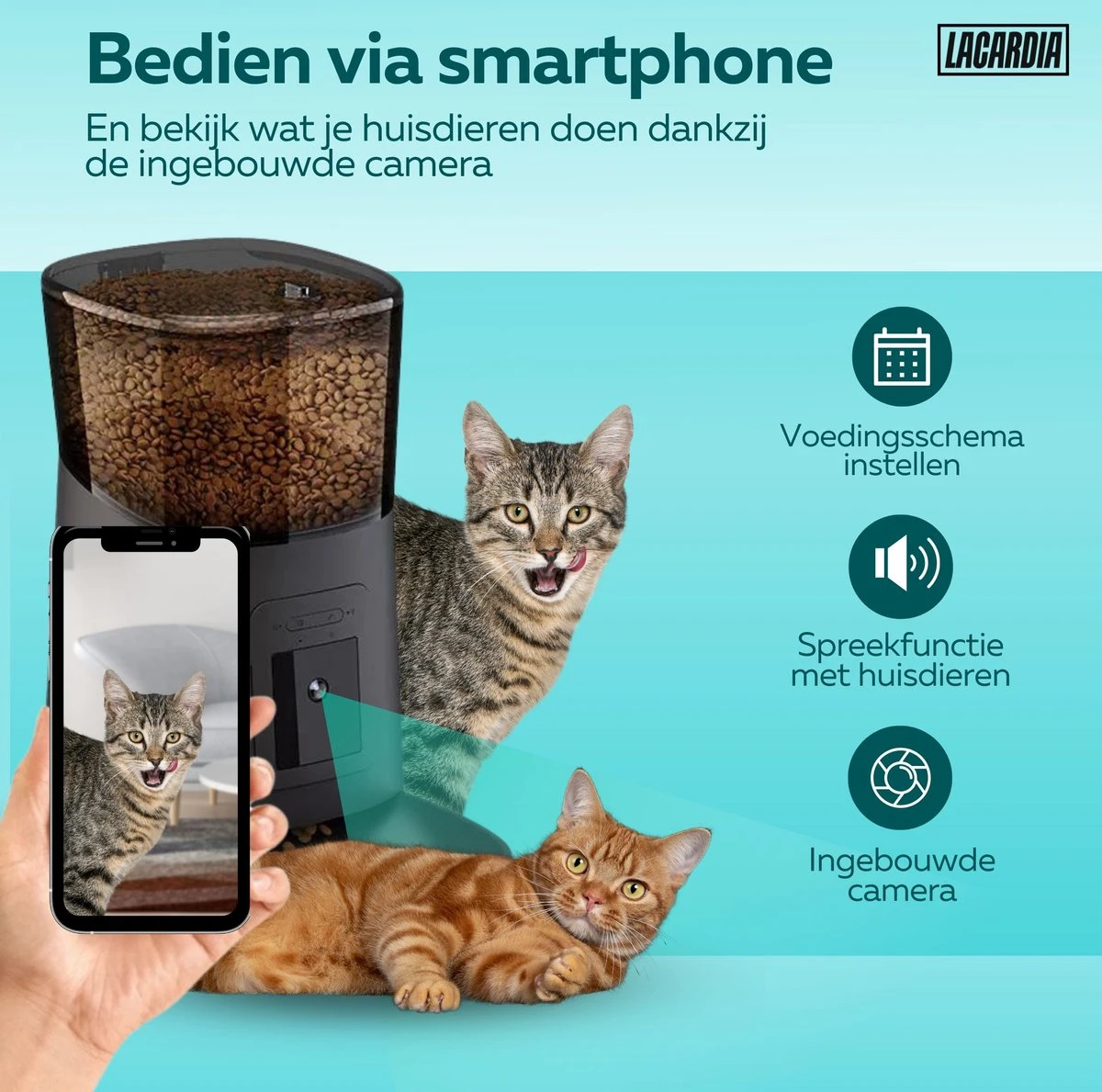 Vaak van huis en genoeg hebben van de buren vragen of ze je huisdier kunnen voeren? Dat is nu verleden tijd met de Lacardia automatische voederbak voor je hond of kat. Automatische voedingsschema’s allemaal bediend vanaf je telefoon. Met de stembediening kan je een automatisch bericht van 10 seconden in spreken om je dier naar de bak te lokken.