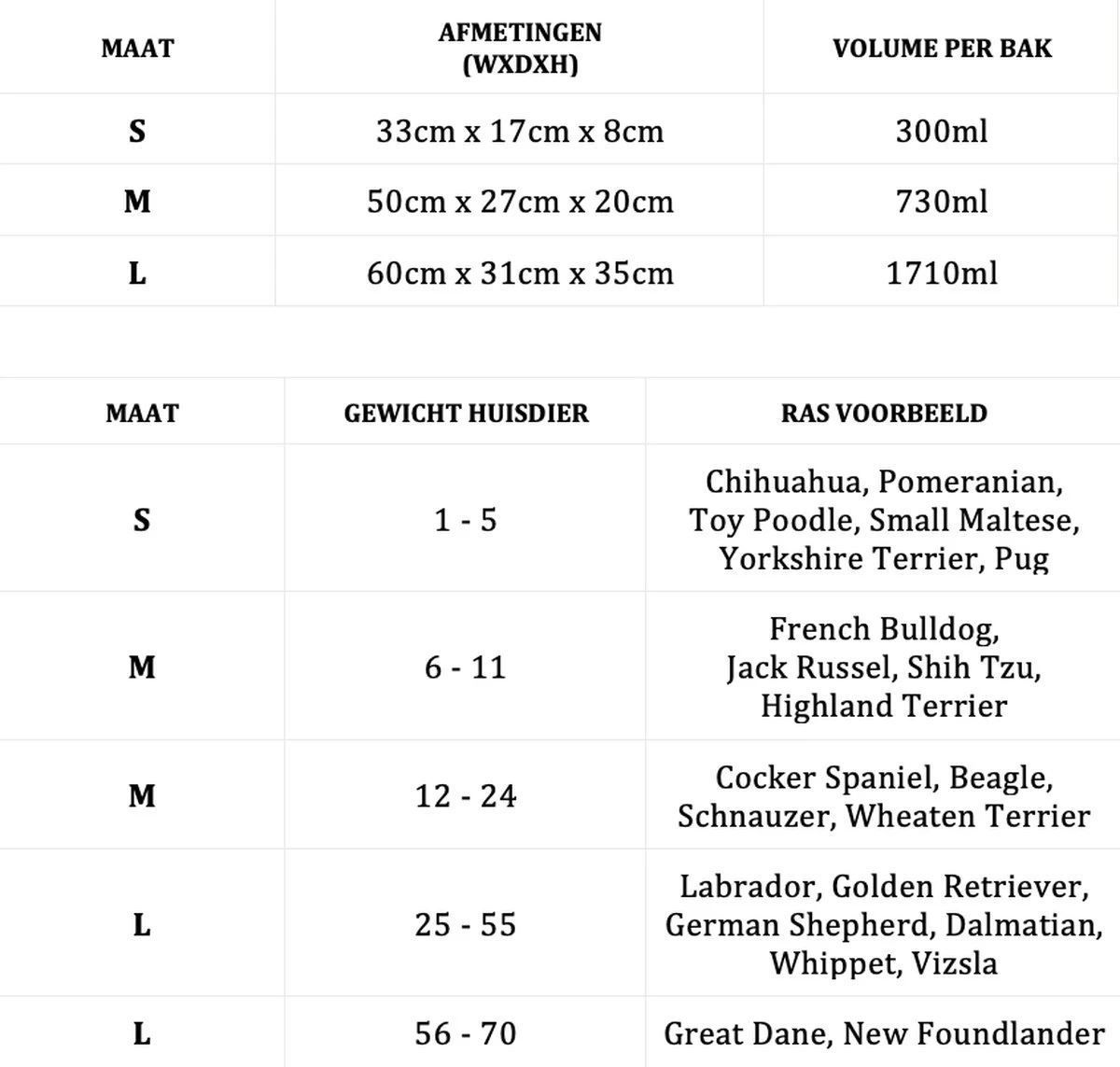Zie maattabel boven bij de productfotos