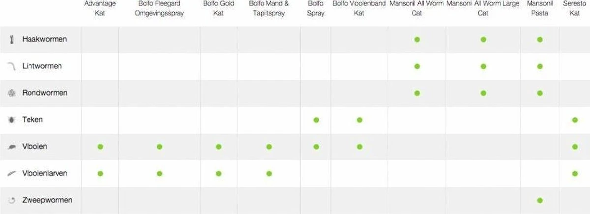 Het ontwormen van uw hond of kat is belangrijk. Wormen zijn een onzichtbare plaag en kunnen bij uw huisdier schade aanrichten. Wormen laten zich pas zien als het dier ernstig besmet is. Wormenbesmettingen zijn ook overdraagbaar op mensen. Het frequent ontwormen is dus noodzakelijk voor de gezondheid van mens en dier. Ook omdat een herbesmetting met wormen zo is opgelopen is frequent ontwormen van belang. Mansonil All Worm is een middel dat een zeer breed spectrum aan wormen doodt. Mansonil All Worm doodt rondwormen en lintwormen. Dit is van belang daar wij met ons blote oog niet kunnen zien met welke worm het huisdier nu eigenlijk besmet is. Er zijn namelijk veel verschillende wormen. De behandelingen met Mansonil All Worm zijn eenmalig. U hoeft het dus niet na bijvoorbeeld een week wederom toe te dienen. Mansonil All Worm® Cat is een ontwormingsmiddel met een brede werking. Het doodt de belangrijkste rond- en lintwormen bij de kat met een éénmalige behandeling.Doodt spoelwormen, haakwormen en lintwormen, waaronder de vlooienlintworm en de vossenlintworm.
