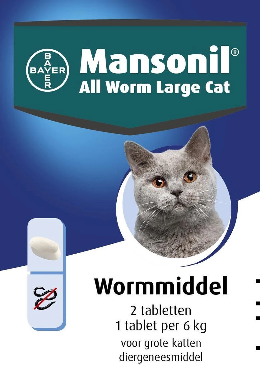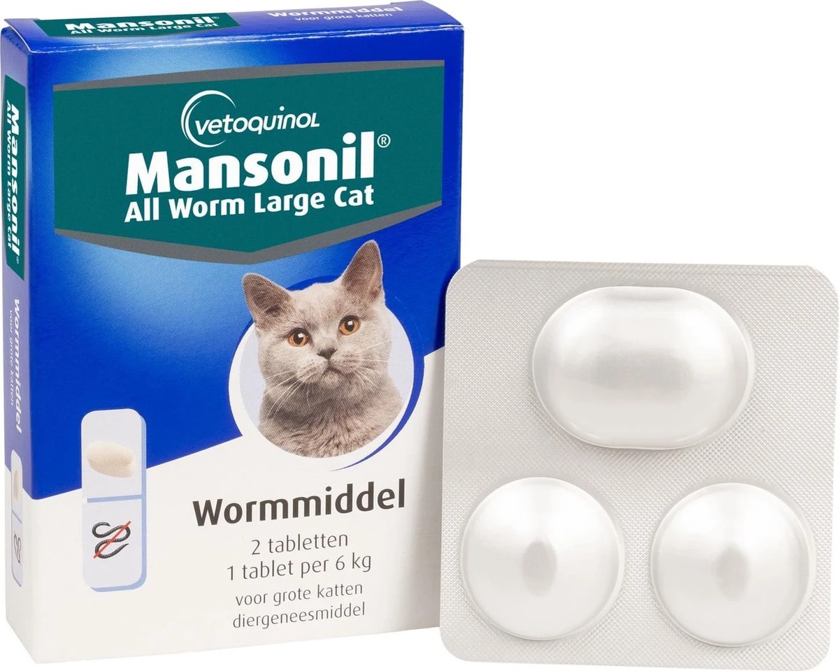 Wormen zijn een onzichtbare plaag en kunnen bij uw huisdier schade aanrichten. Ze laten zich pas zien als het dier ernstig besmet is. Wormenbesmettingen zijn ook overdraagbaar op mensen. Het frequent ontwormen is dus noodzakelijk voor de gezondheid van mens en dier. Ook omdat een herbesmetting met wormen zo is opgelopen is frequent ontwormen van belang. Mansonil All Worm is een middel dat een zeer breed spectrum aan wormen doodt. Mansonil All Worm doodt rondwormen en lintwormen. Dit is van belang daar wij met ons blote oog niet kunnen zien met welke worm het huisdier nu eigenlijk besmet is. Er zijn namelijk veel verschillende wormen. De behandelingen met Mansonil All Worm zijn eenmalig. U hoeft het dus niet na bijvoorbeeld een week wederom toe te dienen. Mansonil All Worm® Large Cat is een ontwormingsmiddel met een brede werking. Het doodt de belangrijkste rond- en lintwormen bij de kat met een éénmalige behandeling.Doodt spoelwormen, haakwormen en lintwormen, waaronder de vlooienlintworm en de vossenlintworm.