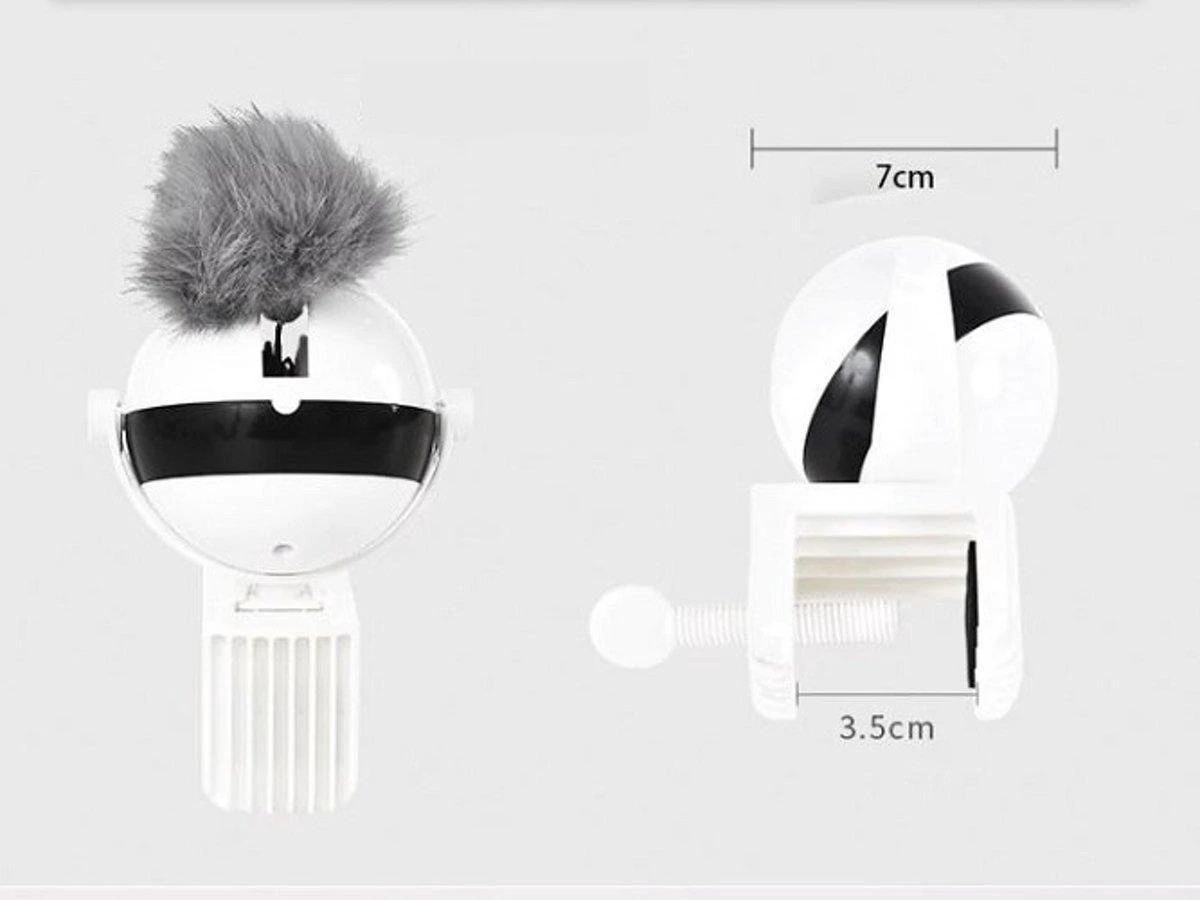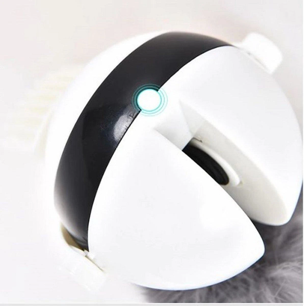 U drukt op de bedieningsknop en de hengelbal begint automatische met hengelen voor ongeveer 5 minuten lang. De hengelbal rolt het touwtje met pluizige balletje/prooi steeds weer op. Dit gaat onregelmatig uw kat ziet het dan niet als een eentonige prooi.