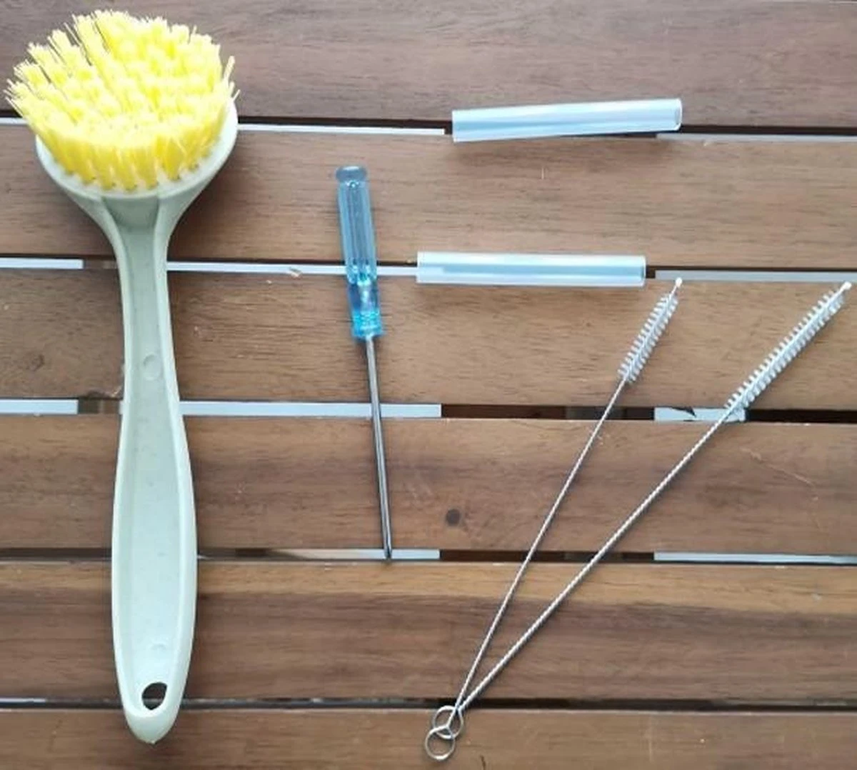Niet iedereen zijn lievelingsklus, maar de fontein dient ook schoongemaakt te worden. Met de bijgeleverde schoonmaak set is dat een eitje van een cent. Bij de bijpassende schoonmaak set zit een kleine schroevendraaien om om de pomp open te draaien, twee steekborstels om de buisjes en moeilijke plekjes schoon te maken, twee vervangende buisjes en een borstel om het keramiek te wassen.