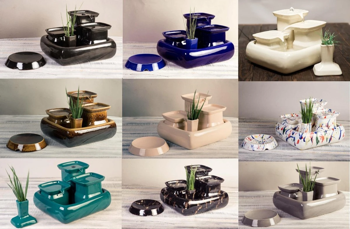Bij deze fontein zit een bijpassende voerbak en kattengras kit.