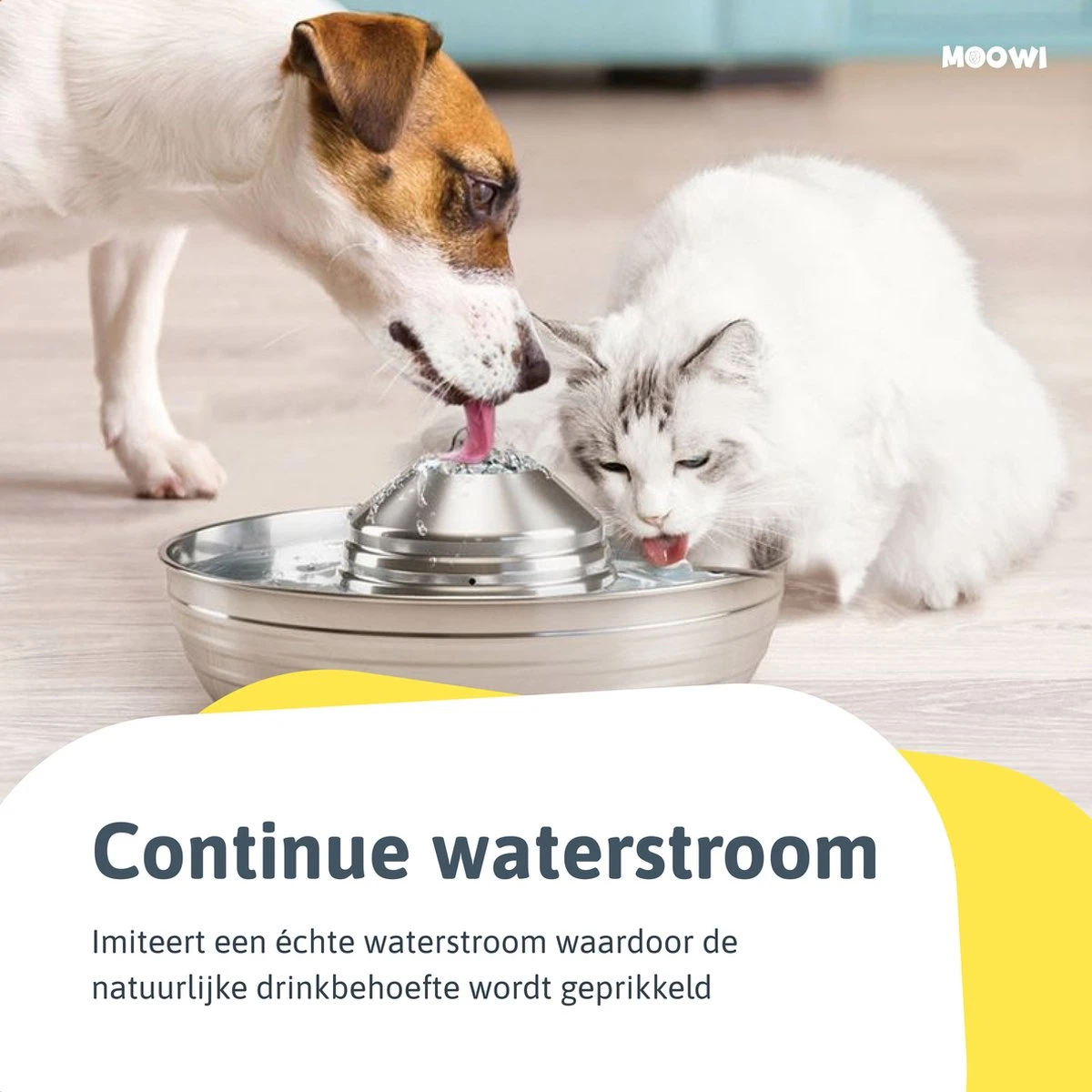 Katten en honden zijn dankzij hun oer-instinct gek op stromend water! Zo pikte evolutie op dat stromend water van nature schoner is dan stilstaand water, waardoor vroege viervoeters een sterke voorkeur voor stromend water ontwikkelden. De drinkfontein van Moowi is daarmee niet alleen de diervriendelijkste keuze – maar dankzij zijn muisstille ontwerp, grote watercapaciteit én roestvrij stalen jasje ook nog eens de meest baas-vriendelijke!