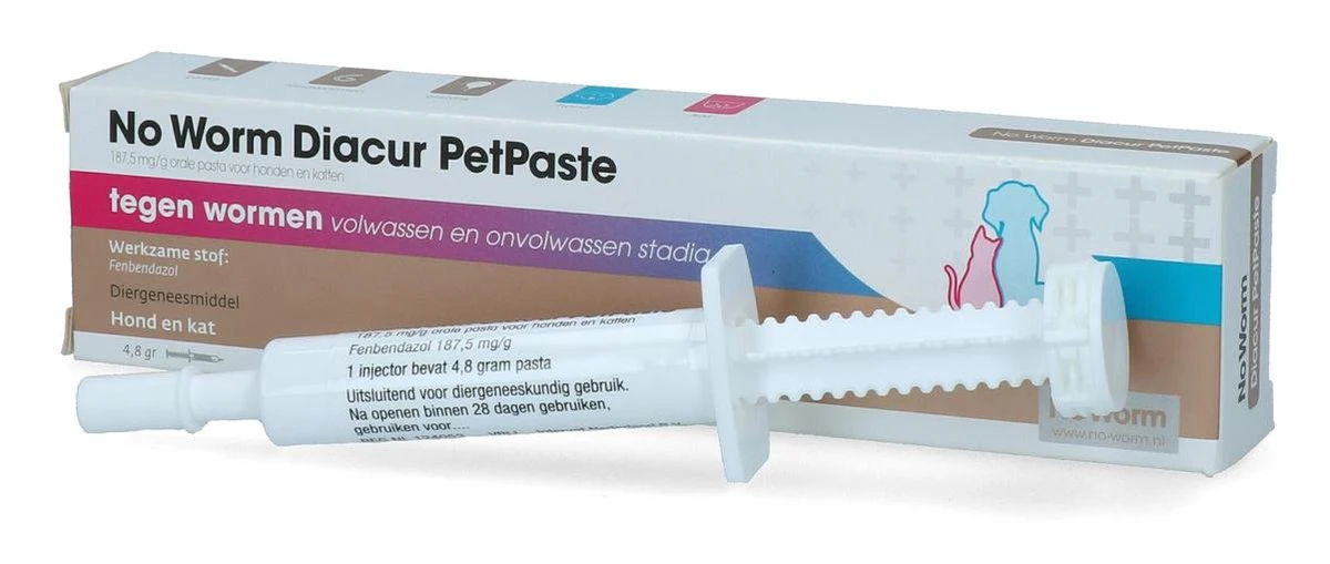 No Worm Diacur heeft een dubbele werking. De meest voorkomende spoel-, zweep-, haak- en lintwormsoorten worden bij hond en kat bestreden! En met de No Worm Diacur PetPaste (Fenbendazol behandeling) wordt daarnaast de Giardia parasiet bestreden bij honden. No Worm Diacur heeft dezelfde werking als Panacur.