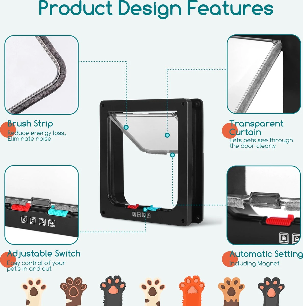 Het kattenluik is gemaakt van duurzaam ABS-kunststof, eenvoudig te reinigen en werkt geruisloos met een borstelstrip. Het magnetische slot zorgt ervoor dat de kattenluik na gebruik weer in zijn oorspronkelijke positie komt. Winddicht en beschermt tegen tocht. Zodat het binnen niet gaat vriezen in de winter of stormachtige herfst.