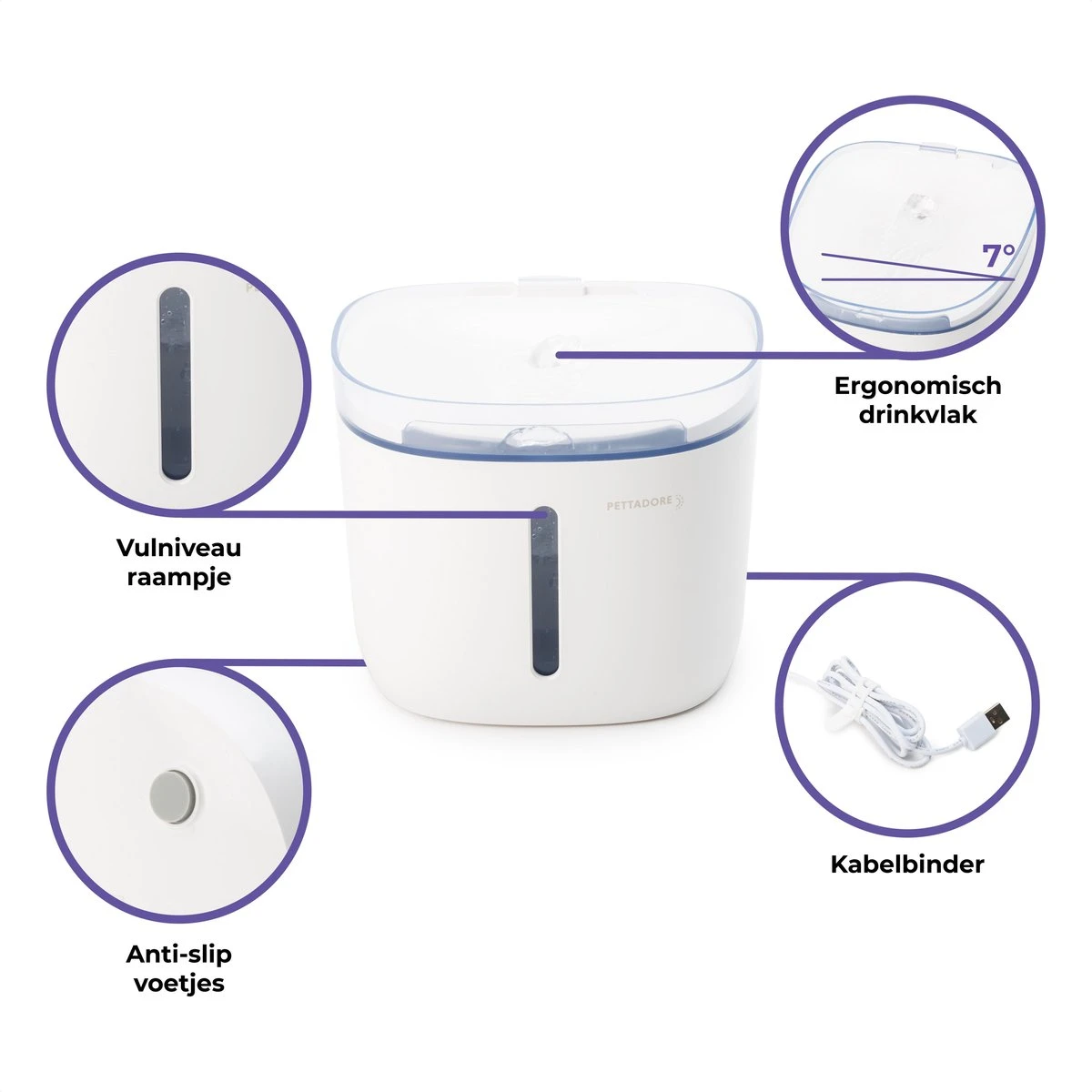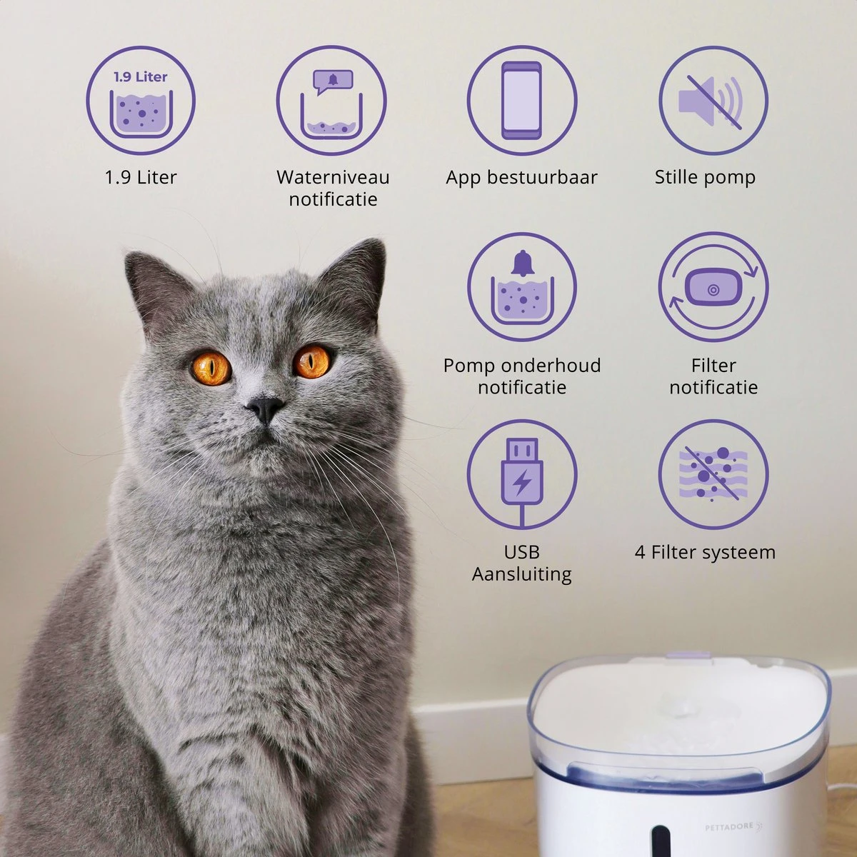 De smart drinkfontein Hydrate Compact van Pettadore is een slimme drinkfontein voor katten en honden. De waterfontein is verbonden met een app en heeft een waterreservoir van 1,9 liter. Het 4 filtersysteem en pomp houden het water schoon en zorgen voor veel zuurstof in het water. De kattenfontein heeft gedempt geluid en verbruikt weinig energie. De app weergeeft het waterniveau inclusief de werking en herinneringen van de smart drinkfontein!