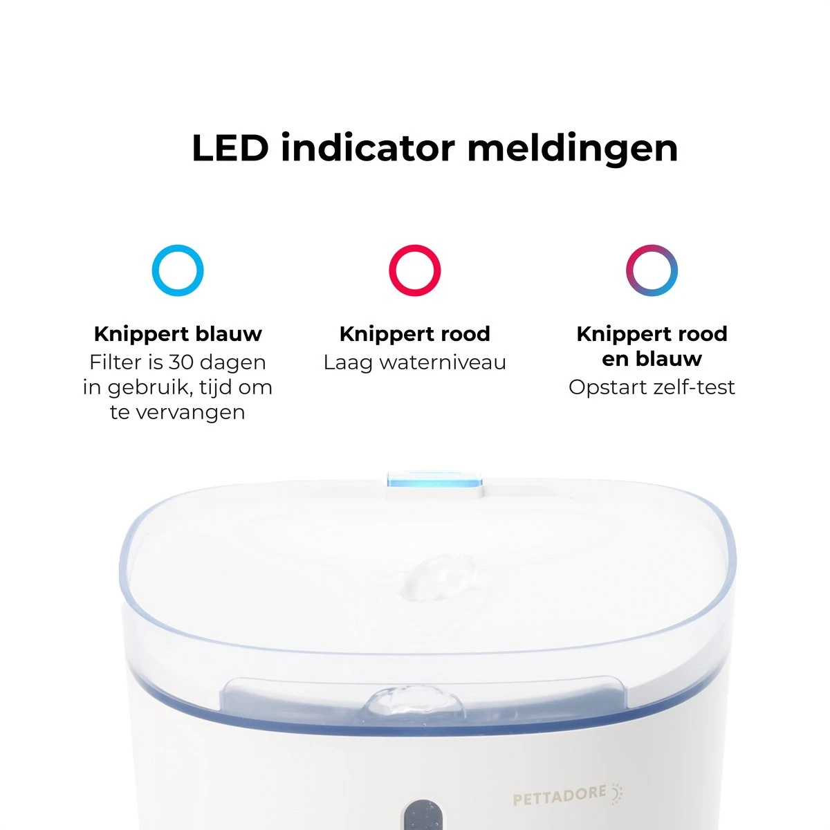 De Pettadore smart drinkfontein Hydrate Compact is via jouw smartphone bestuurbaar en weergeeft hierop het waterniveau inclusief de werking en herinneringen. Zo krijg je een melding als het water bijna op is en wanneer de filter vervangen moet worden of de pomp een schoonmaak nodig heeft. Geïntegreerd zit een aan/uit modus voor het uit of inschakelen van het LED licht. Je kunt ook de werkingsduur van het apparaat bepalen vanaf een afstand via jouw smartphone.