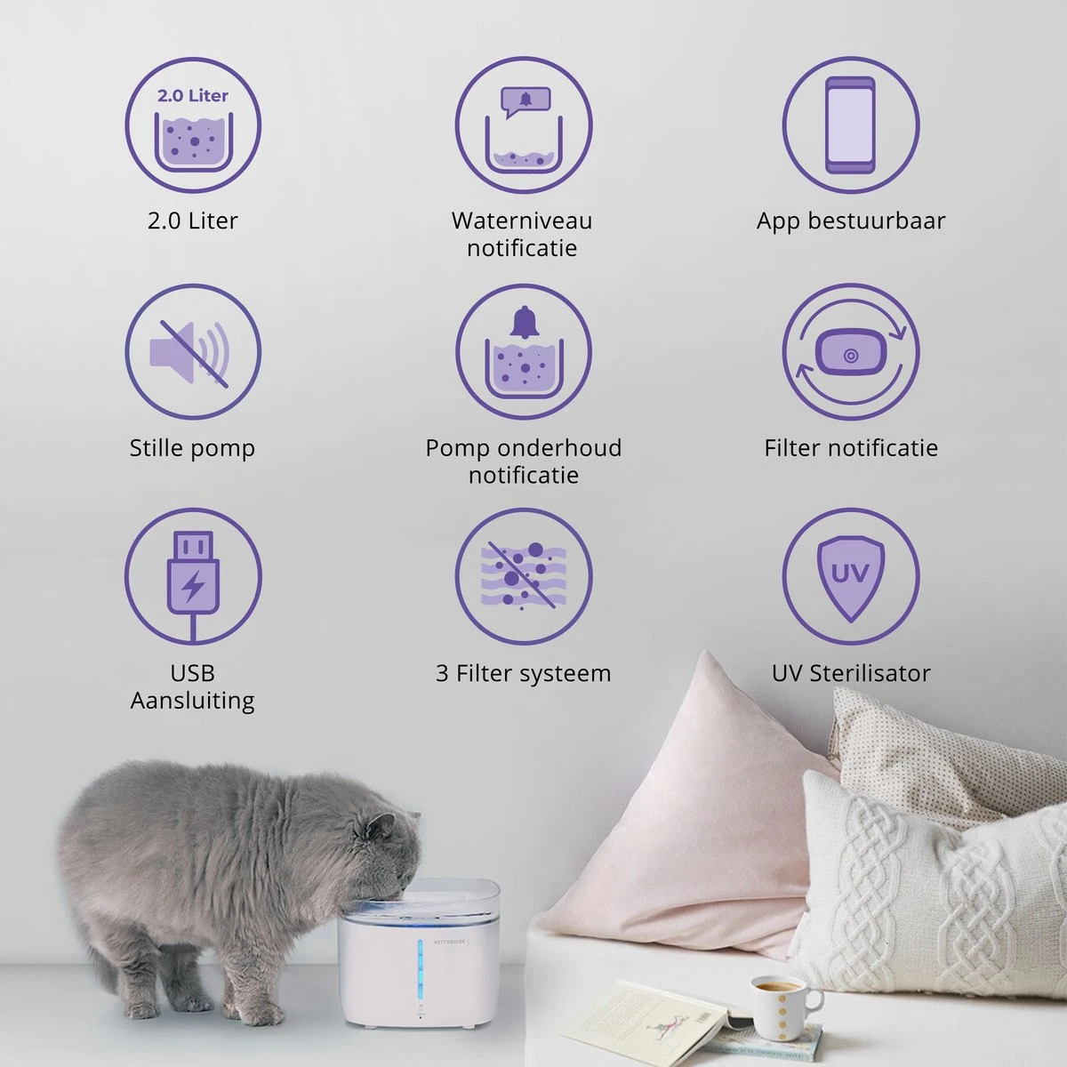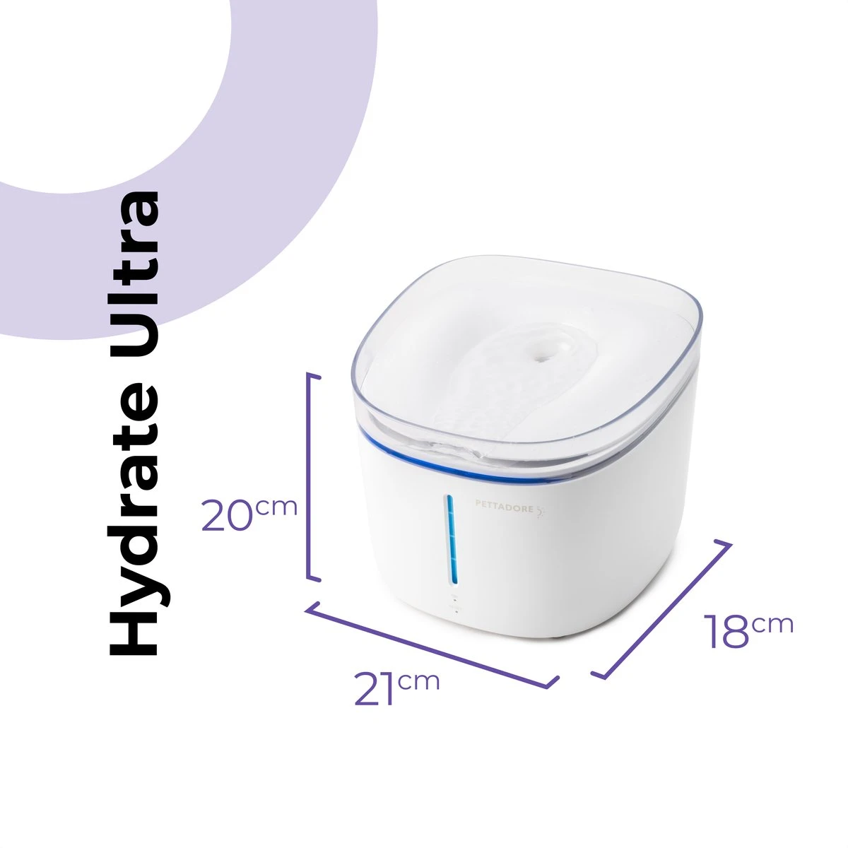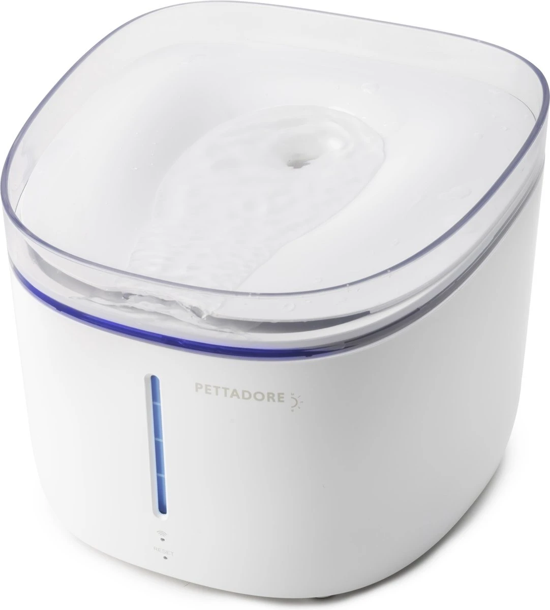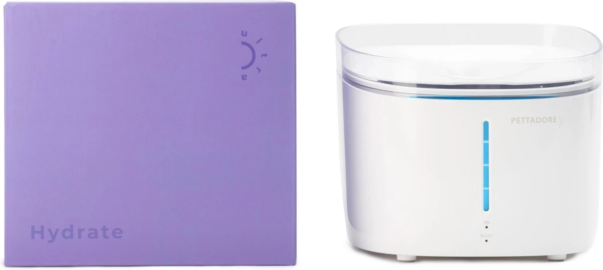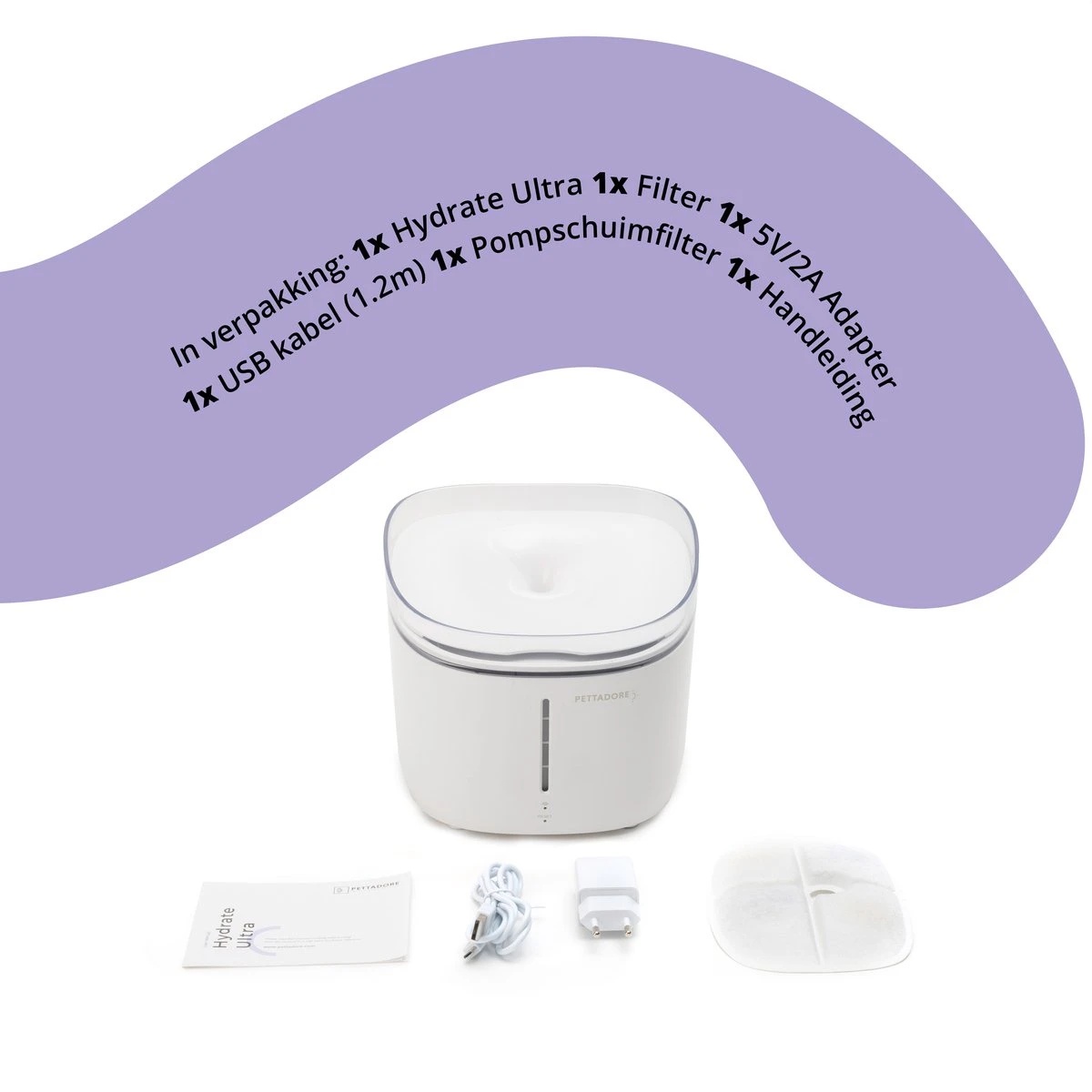 De smart drinkfontein Hydrate Ultra van Pettadore is dé slimme drinkfontein voor katten en honden. De waterfontein heeft een app en een waterreservoir van 2 liter. Het 3 filtersysteem, de UV-bacteriedoder en pomp houden het water bacterievrij, schoon en zorgen voor veel zuurstof in het water. De kattenfontein heeft gedempt geluid en verbruikt weinig energie. De app weergeeft het waterniveau en waterzuiverheid in de smart drinkfontein!