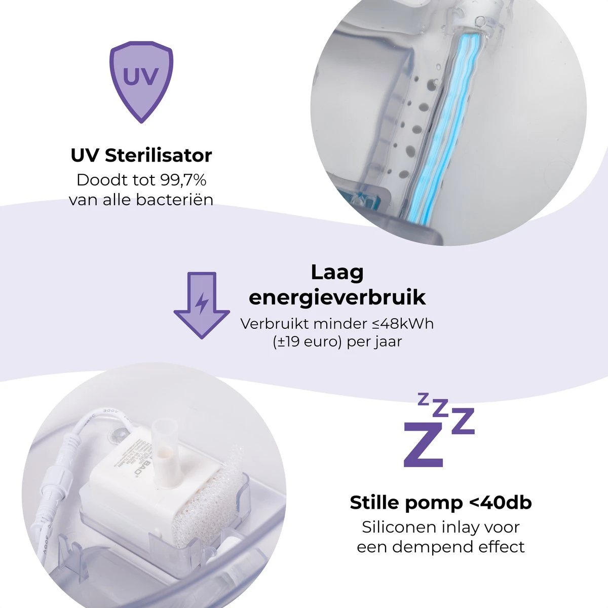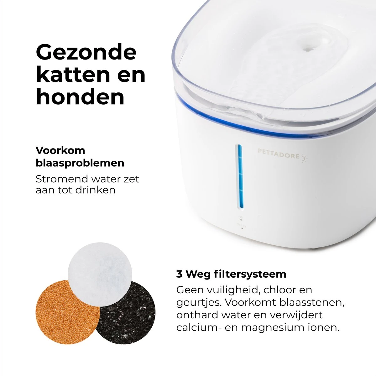 Katten en honden als huisdier zijn slechte drinkers, we hebben de verantwoordelijkheid om drinken daarom extra aantrekkelijk te maken. Bij weinig drinken is de kans op blaasproblemen extra groot! Het voordeel van de slimme waterfontein is dat het water, door het pompje en de 3 verschillende filters, altijd vers blijft. Katten en honden drinken meer wanneer het water stroomt en vers is.