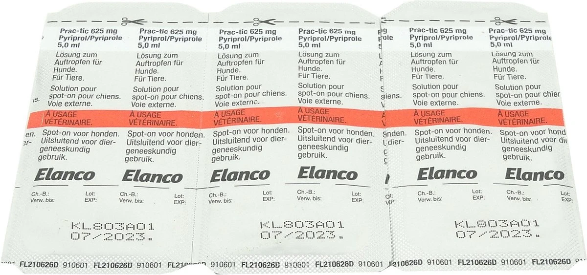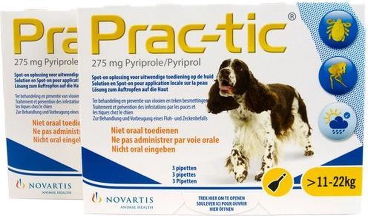 Prac-Tic helpt bij de preventie en behandeling van vlooien en teken besmettingen. Het is een spot-on Oplossing voor honden vanaf 1 tot 50 kilo. Het middel bevat pyriprole. Prac-Tic is het enige anti vlooien en teken middel dat speciaal gemaakt is voor honden hierdoor is het erg veilig voor de huid van uw hond. Prac-Tic is waterbestendig en daarom perfect voor de fanatiek zwemende viervoeters onder ons. Bewaar de pipetten zo lang mogelijk in de verpakking en bewaar het niet op een plek warmer dan 25 graden.