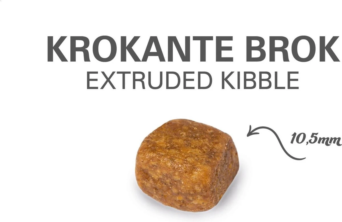 – grote brokken voorkomt snel eten en gaat tandsteen tegen.
