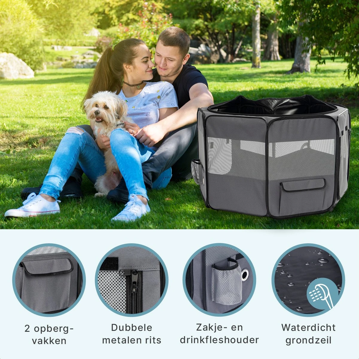 De puppyren bestaat uit 8 panelen allen voorzien van een gaasvenster, waarvan 2 met een open te ritsen deur. De boven- en onderkant is eenvoudig afritsbaar voor een makkelijke toegang. De onderkant is gemaakt van waterdicht materiaal en is eenvoudig te reinigen met een vochtige doek of je kunt deze afspoelen.