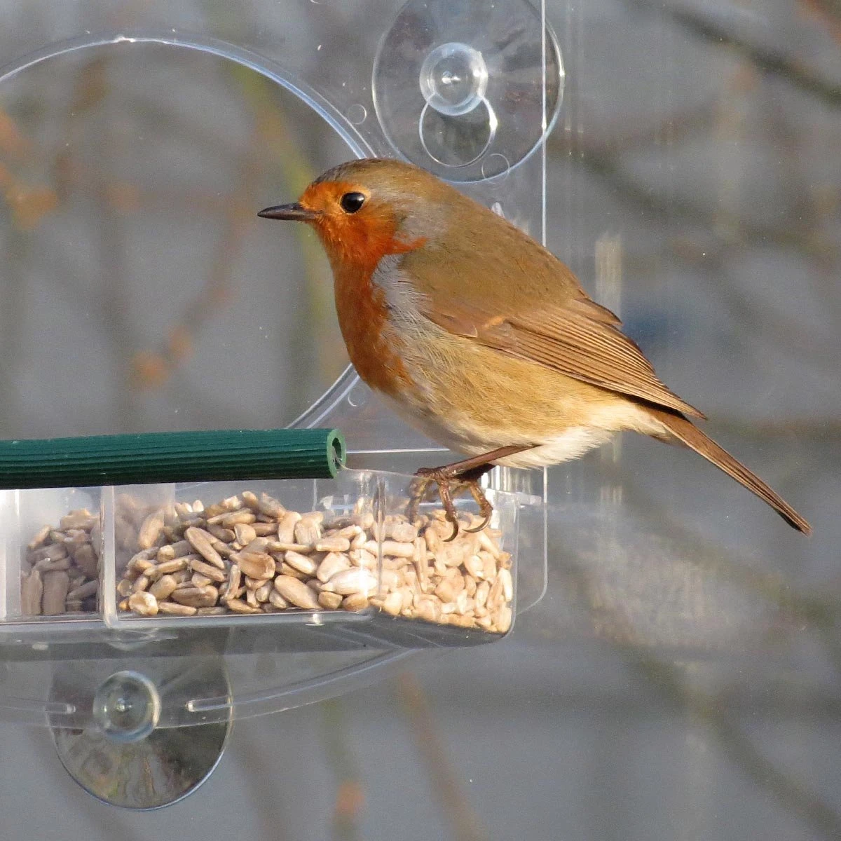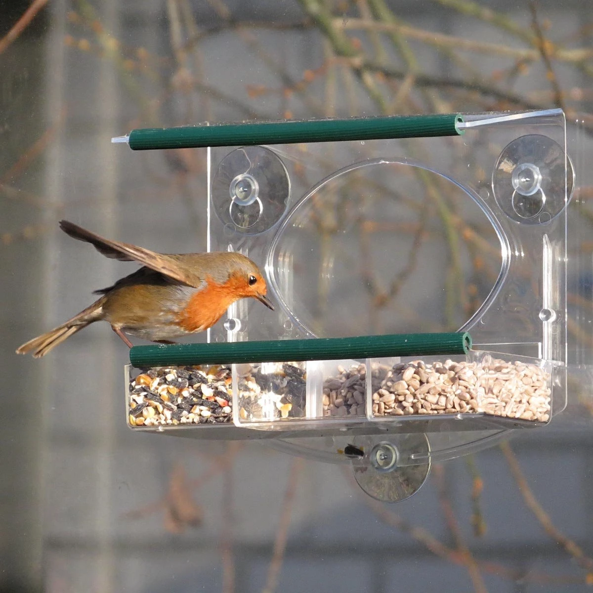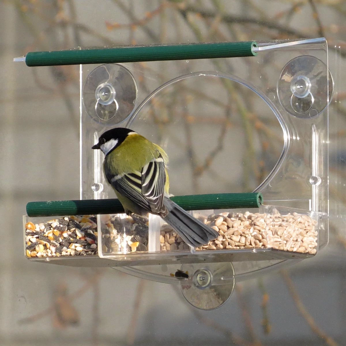 Uniek voederhuisje tegen het raam: Mensen en vogels kijken bij elkaar op tafel.