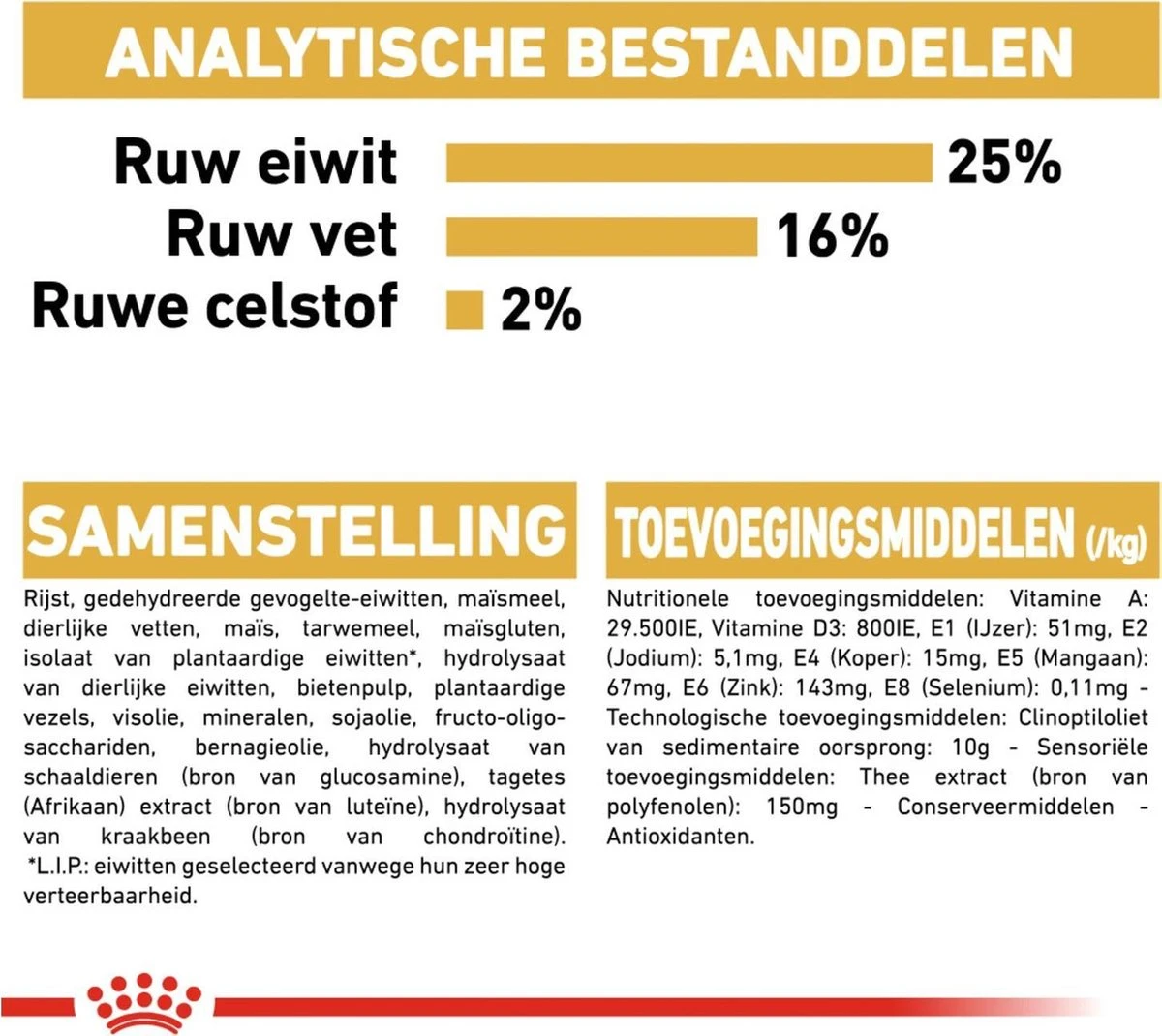 | Voedingswaarde | Samensteling: rijst, gedehydreerde gevogelte-eiwitten, maïsmeel, dierlijke vetten, maïs, tarwemeel, maïsgluten, isolaat van plantaardige eiwitten*, hydrolysaat van dierlijke eiwitten, bietenpulp, mineralen, plantaardige vezels, visolie, sojaolie, Fructo-Oligo-Sacchariden, bernagieolie, extracten uit groene thee en druiven (bron van polyfenolen), hydrolysaat van schaaldieren (bron van glucosamine), tagetes (Afrikaan) extract (bron van luteïne), hydrolysaat van kraakbeen (bron van chondroïtine) |