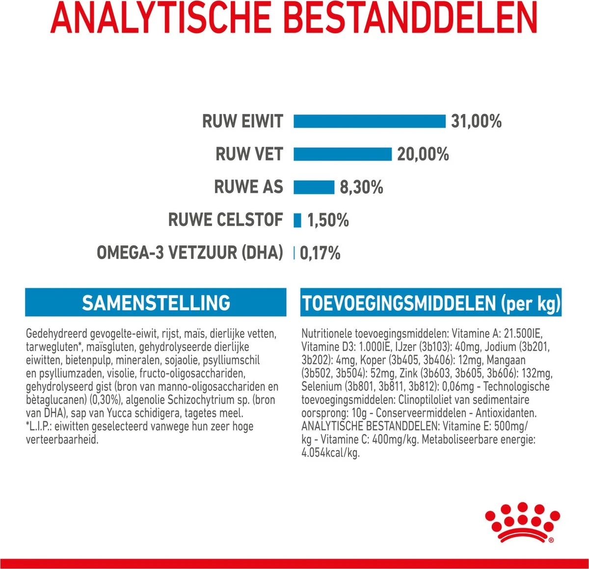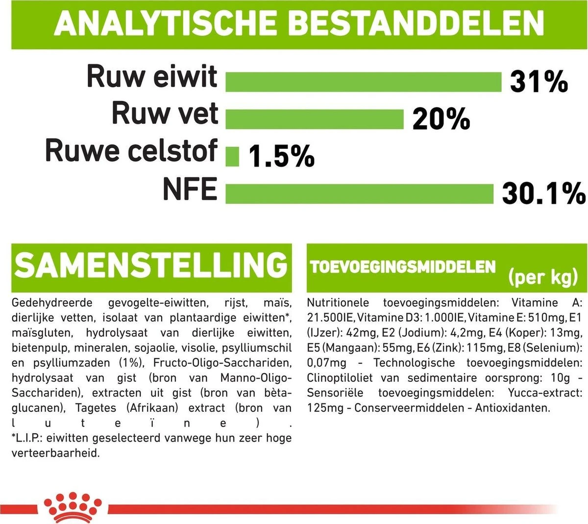 | Analytische bestandsdelen | Analyse: Ruw eiwit: 31.00% – Ruw vet: 20.00% – Ruwe as: 7.10% – Ruwe celstof: 1.50% |