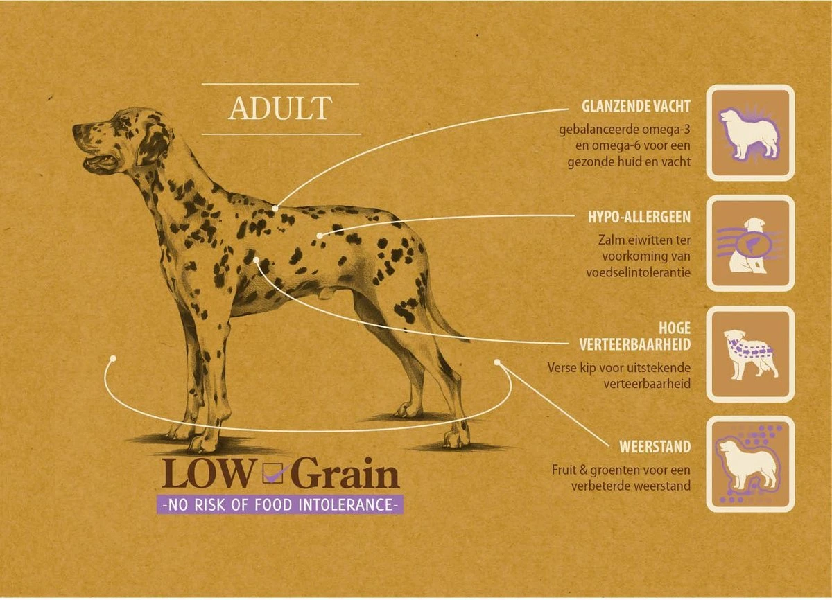| Voedingswaarde | : 13 kg. Smaak: Zalm&Aardappel. Zalm, aardappel, mais, gevogeltevet (geconserveerd met gemengde tocoferolen, een bron van vitamine E) zalm olie, natuurlijke smaakstoffen, gedroogde appels, biergist, tomaten, yucca schidigera extract, wortelen, mineralen, DLmethionine, l-lysine, mannan-oligosachariden, fructo-oligosachariden, probiotica. |