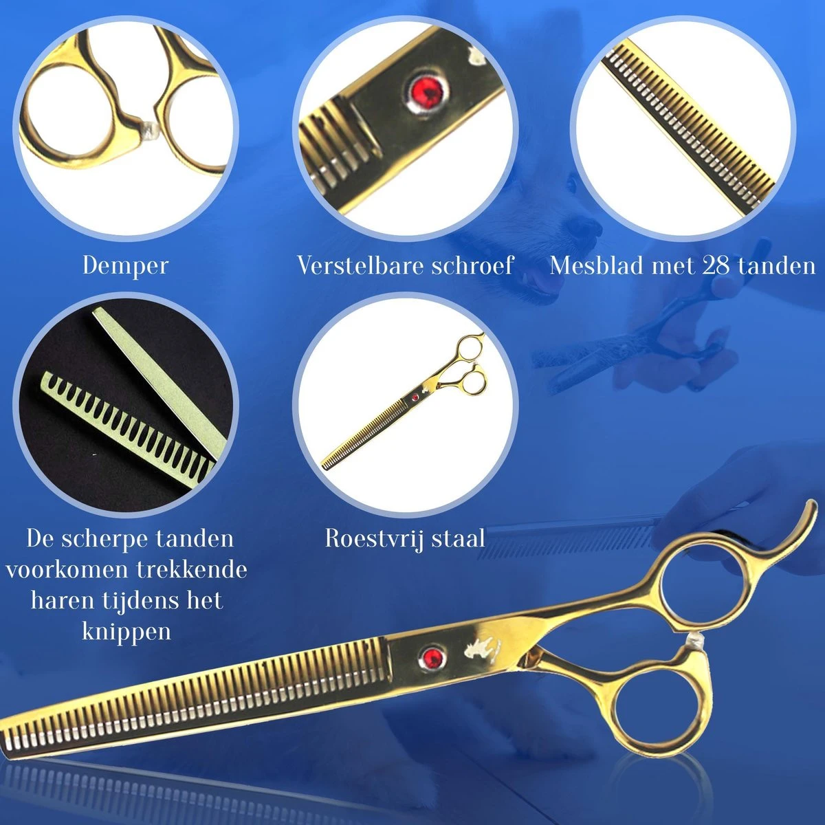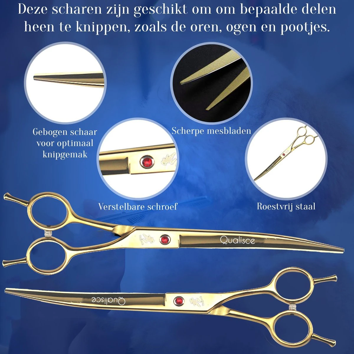 Met de vier verschillende scharen in deze set kunt u elke vacht temmen. Zo zorgt u voor een piekfijn trimsalonwaardig resultaat en kunt u uw huisdier van elke gewenste coupe voorzien. Ook bevat deze set een oor/oogtrimmer. Dit is een klein schaartje waarmee u met precizie de vervelende haartjes rond de ogen/oren weg kan halen zodat uw huisdier zonder enige pijn weer optimaal kan zien en horen.