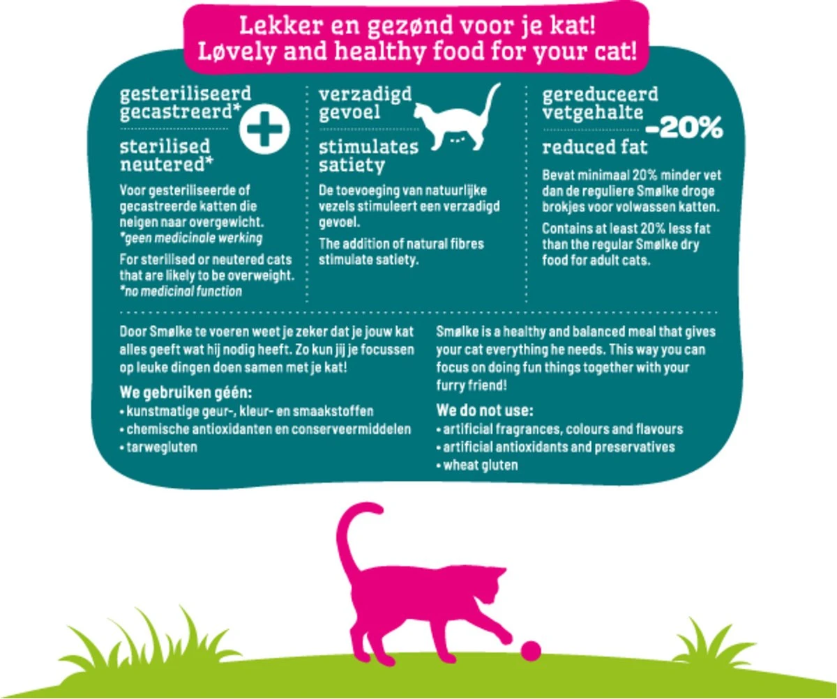Smølke Weight Control bevat 40% minder vet dan de reguliere Smølke kattenbrokjes voor volwassen katten, maar voorziet wel in alle voedingsbehoeften. De extra vezels in de voeding zorgen voor een verzadigd gevoel. Door de toevoeging van L-Carnitine en Choline wordt de vetverbranding extra gestimuleerd. Als de kat zijn streefgewicht heeft bereikt kan deze worden teruggezet op zijn normale voeding. Katten die aanleg houden tot overgewicht kunnen permanent Smølke Weight Control krijgen.