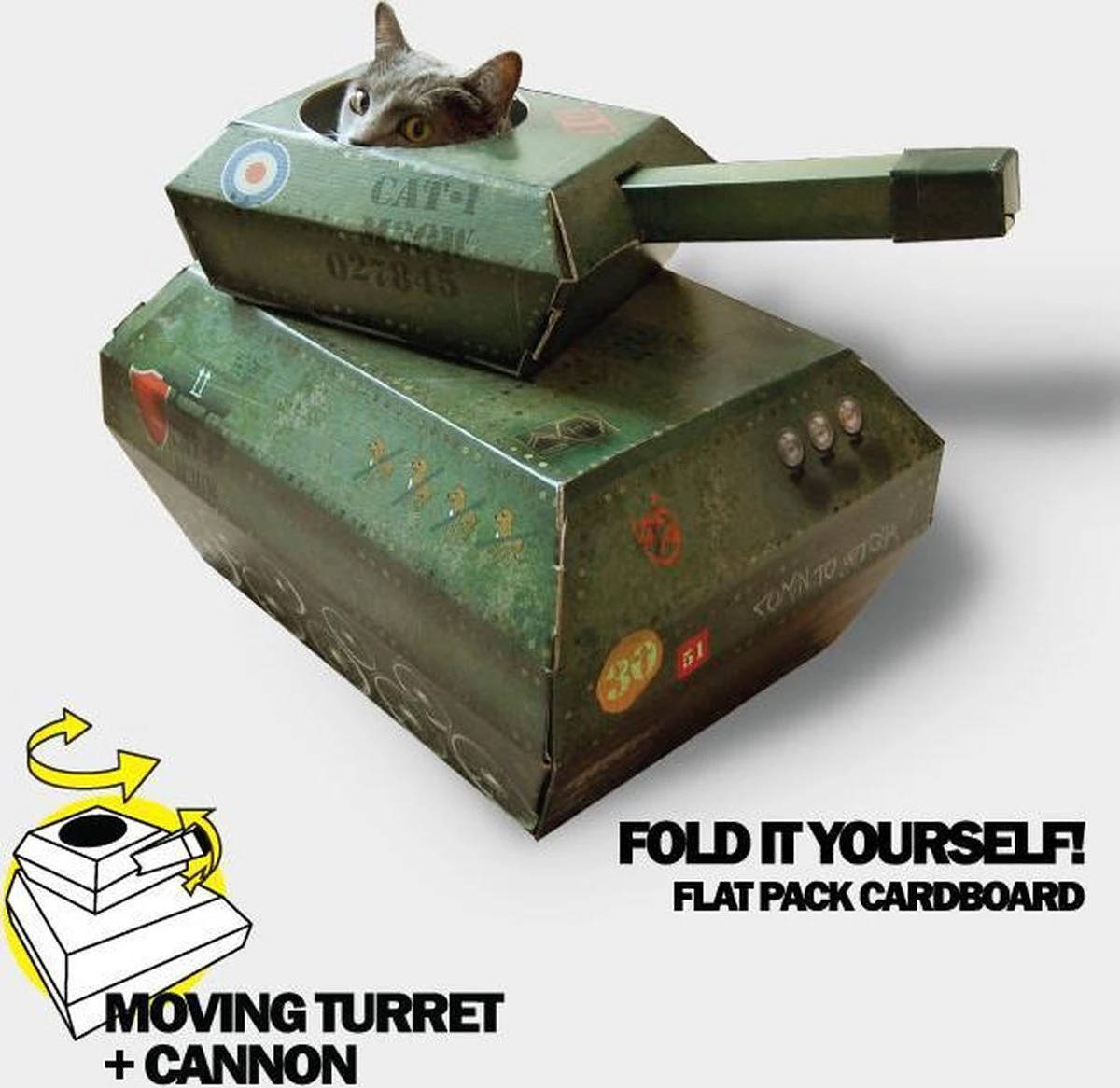 Kartonnen tank Speelhuis voor uw kat. Eenvoudige zelfmontage met geïllustreerde instructies inbegrepen. Een nieuw kattenspeelgoed dat eindeloos veel plezier zal brengen. Vouw het duurzame en stevige karton in de speelse structuur en kijk hoe uw kat zijn volledige krachtige potentieel begint te bereiken. Een geweldig alternatief voor je bank en een grappige afleiding voor je katten.
