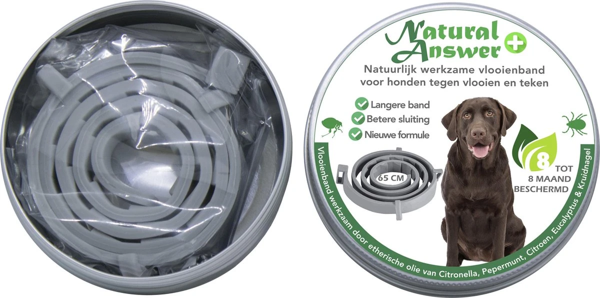 Met de vernieuwde vlooien- en tekenband (PLUS) van Natural Answer kunt u gerust zijn dat uw hond vlo- en tekenvrij wordt en blijft. Deze band is nu langer, heeft verbeterde gespen en heeft een nog krachtigere maar prettige combinatie van etherische oliën. Deze band is veilig voor mens, hond en milieu maar de oliën zijn een effectief middel tegen vlooien en teken. Deze band is universeel inzetbaar. Dus geschikt voor alle soorten honden en vachttypen.
