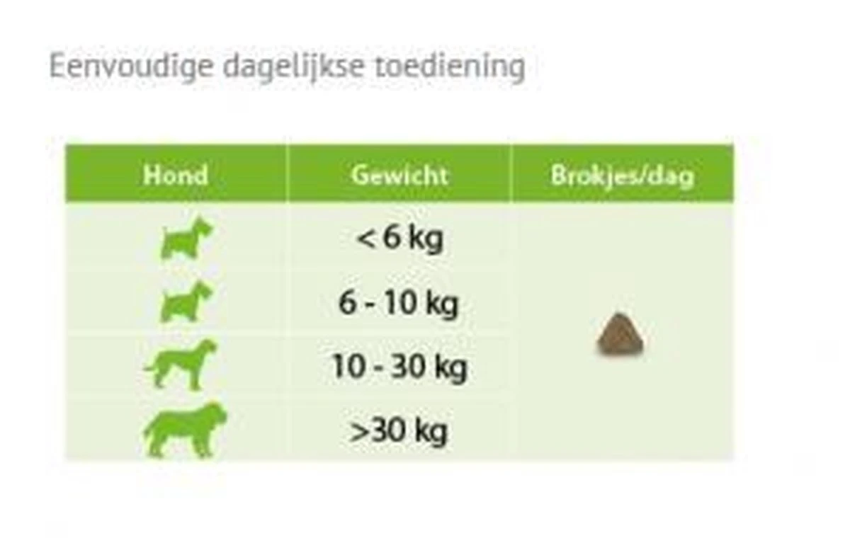 | Gebruiksaanwijzing | Honden als aanvullend dieetvoer, voor de ondersteuning van het metabolisme van de gewrichten in geval van osteoartritis |