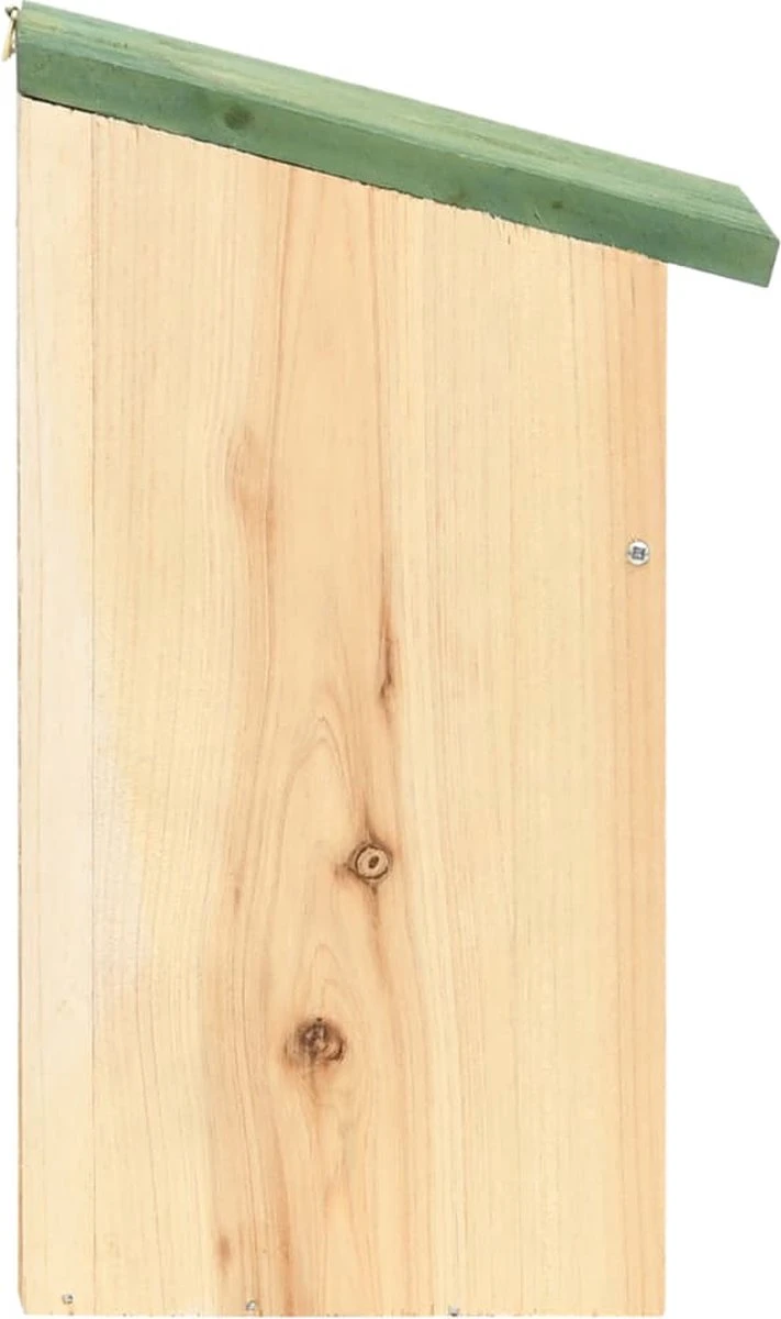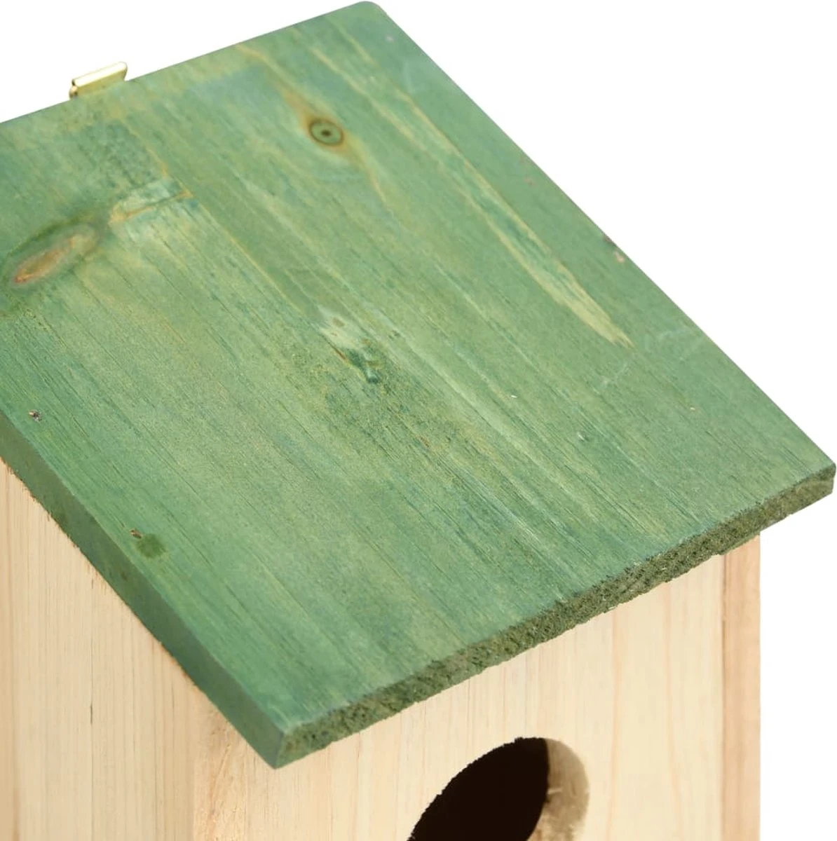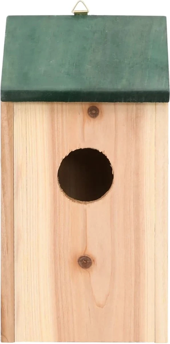 Het wordt geleverd met een groen dak en houtkleurige behuizing. Het is zowel een mooi als veilig vogelnest. Dankzij het metalen ophangonderdeel kan hij meteen in je tuin opgehangen worden.