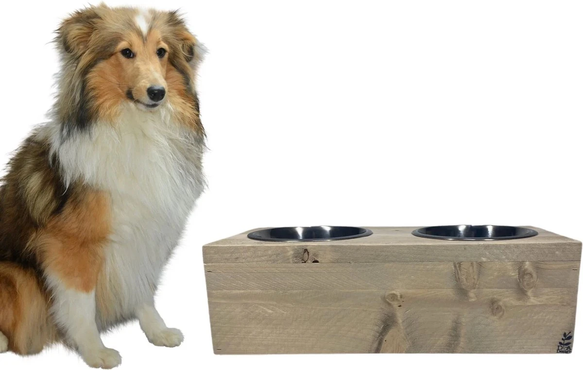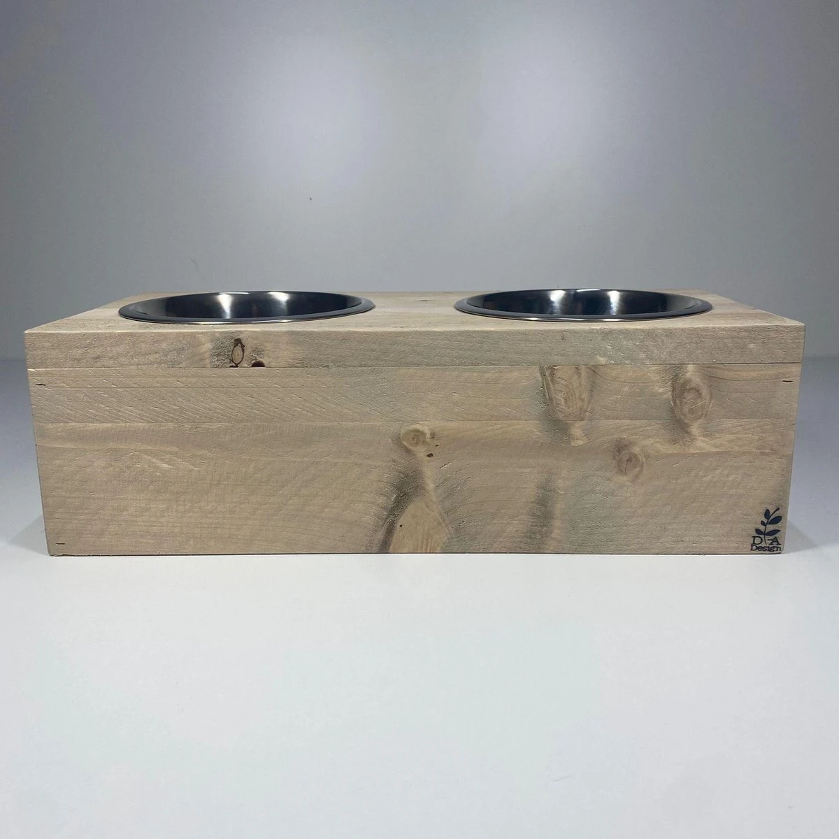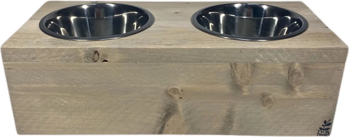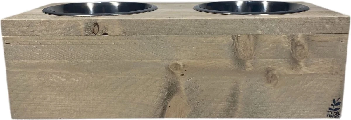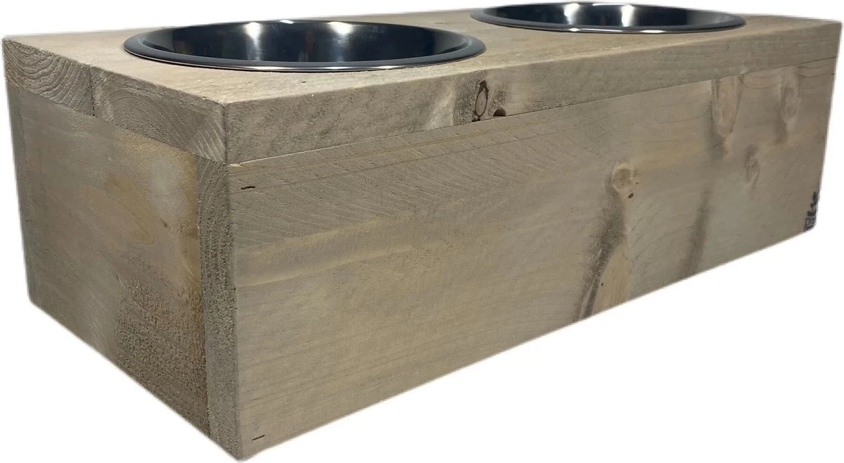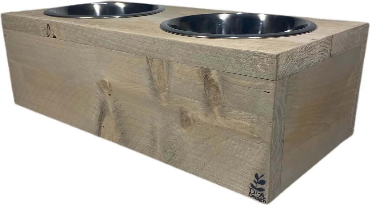 | Verpakkingsinhoud | – 1 handgemaakte steigerhouten voerbak met 2 bijbehorende RVS voerbakjes. |