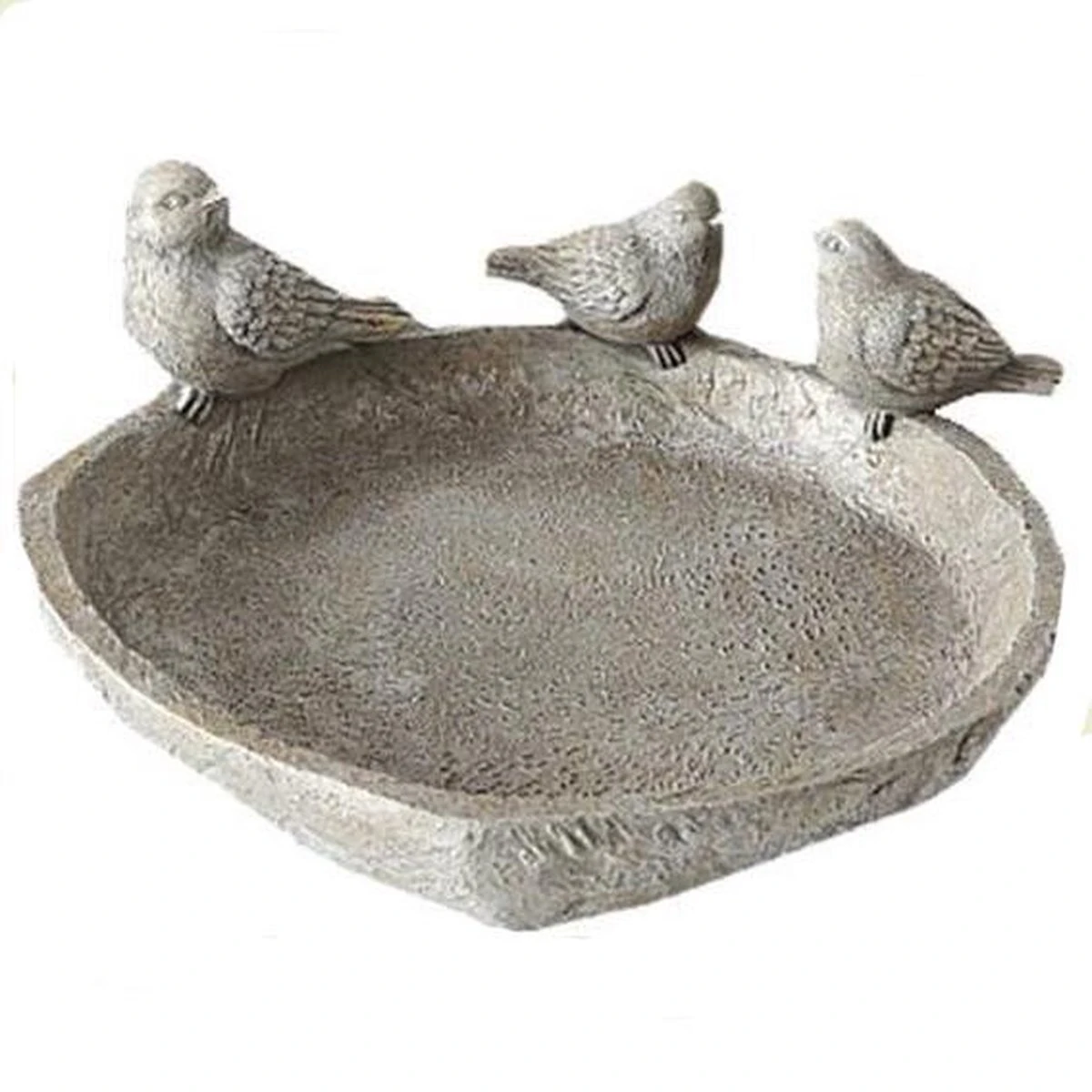 Vogelbadje grijs met 3 vogeltjes op de rand Het vogelbadje is uitgevoerd in grijze kunsthars. Lengte: 22 cm Breedte: 22 cm Hoogte: 8 cm