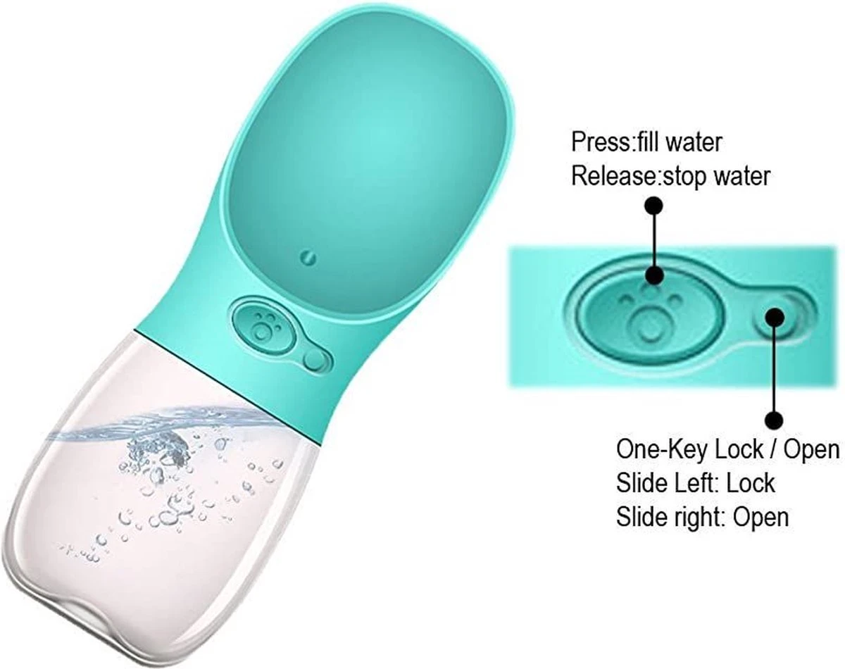 Voorkom dat je hond dorst krijgt tijdens buitenactiviteiten, met deze draagbare, lekvrije en compacte honden drinkfles of honden bidon houdt je de hond gehydrateerd. Deze kwaliteit honden bidon verdeelt water in de aangesloten minischaal met een druk op de knop en zuigt onafgemaakt water terug in de fles.