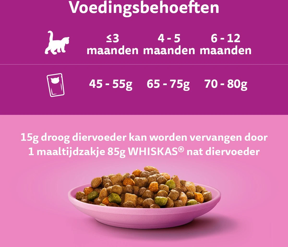 En dat niet alleen… De Whiskas® brokjes zijn onweerstaanbaar. Krokant vanbuiten en heerlijk mals vanbinnen. Elk brokje zit vol smaak, natuurlijke ingrediënten en essentiële voedingsstoffen. Alles wat je kitten nodig heeft om tot een grote en sterke kat uit te groeien!
